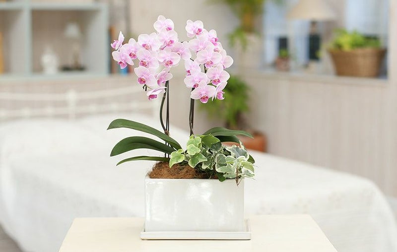 観葉植物との胡蝶蘭の寄せ植えがかわいいグリーンミックス胡蝶蘭。