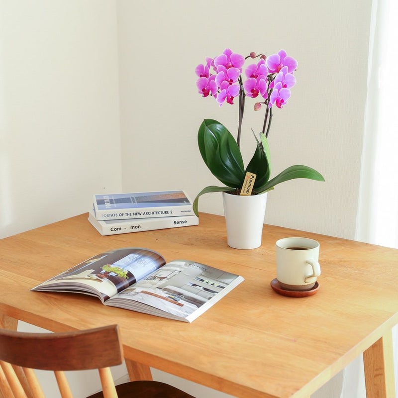 いつもの場所に胡蝶蘭を添えるだけで、気持ちがふんわりと華やぐ空間へ。生きたお花は部屋に瑞々しさをプラスし、あなたに癒しと活力を届けてくれます。また、見ていて飽きない凛とした花姿も、胡蝶蘭だからこそのチャームポイント。思わず笑顔も咲かせるような、心くすぐるお花をテーブルのアクセントに。