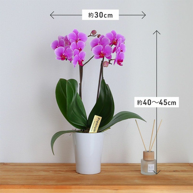 花びらが蝶の舞う姿に似たことから名づけられた胡蝶蘭は、美しく魅力的な存在。その中でも、インテリアに馴染みやすいラージサイズのミディ胡蝶蘭は、エントランスやリビングに置けば華やかな空間を演出します。 茎に沿って連なる花姿の凛とした美しさと、「幸福が飛んでくる」という素敵な花言葉から、お祝いや記念日の贈り物としても喜ばれる特別なお花です。