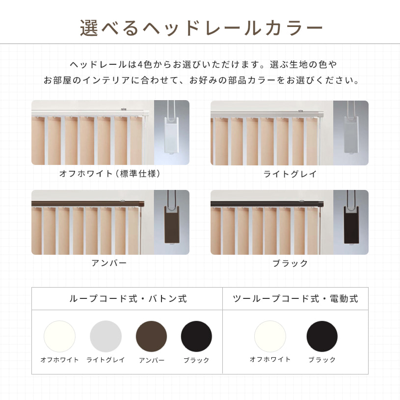 ヘッドレールのカラーは4色からお選びいただけます。設置部分の窓枠等に合わせてお選びいただく事をおすすめいたします。※コードウェイト、バトン、回転操作棒、操作コードも同系色となります。