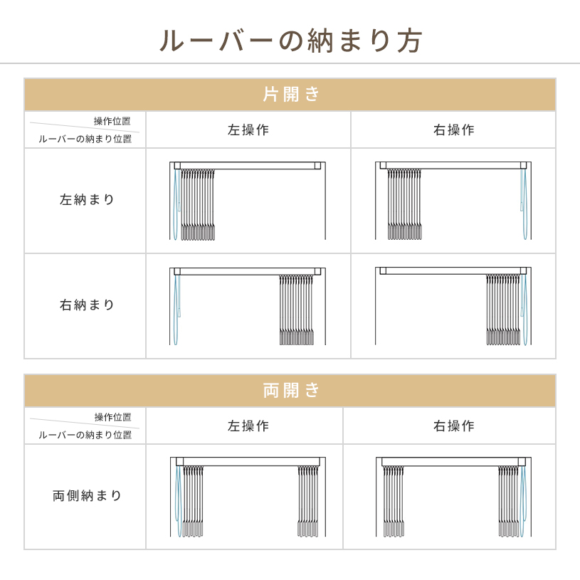 カーテン同様、ルーバーの納まり方をお好みでお選びいただけます。出入りの多い方向など、ご利用のシーンによってお選びください。