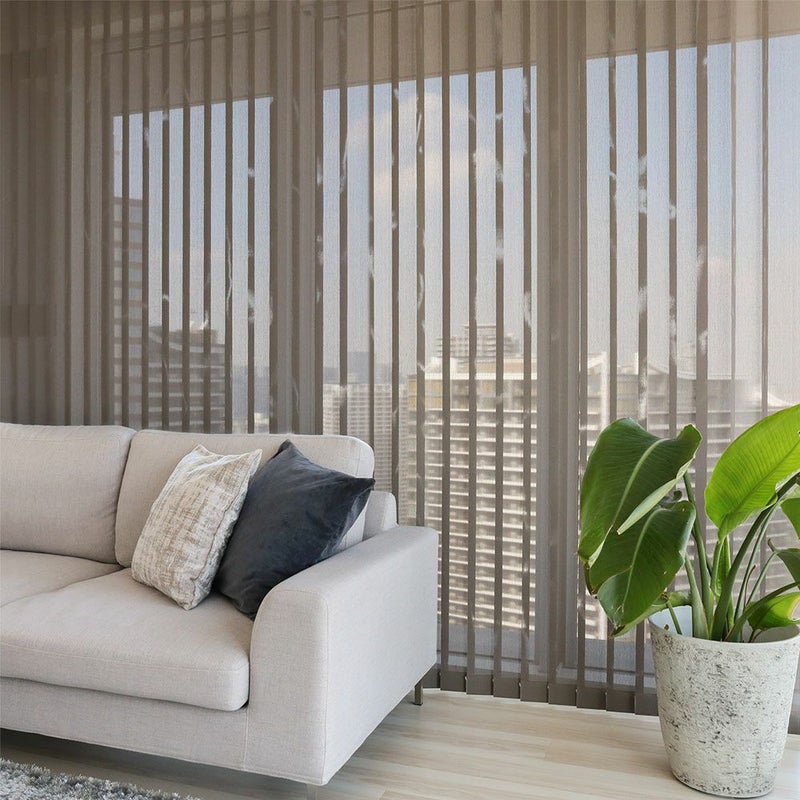 自在に開放でき、閉じたままでも景色を存分に楽しめるシースルーバーチカルブラインドは数少ない代物。窓の端から端まで景色を見渡せ、空間を広く見せる効果も。自慢の眺望を活かす、最先端な窓辺をデザインして。