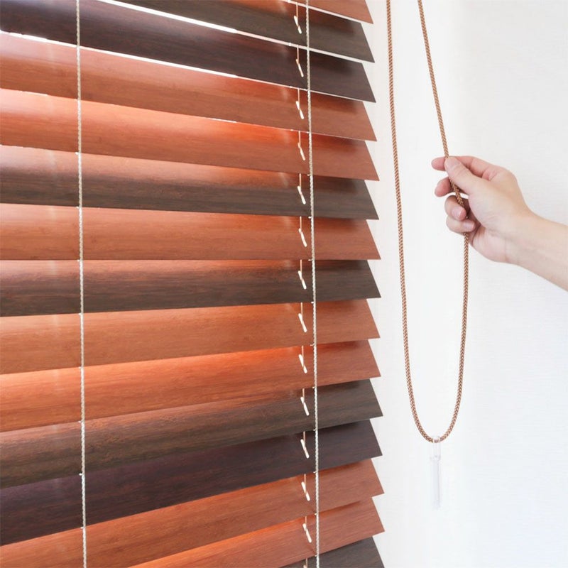 操作は、昇降と調光が1本の操作コードで行えて、見た目もシンプル。竹素材で軽いうえに、メカ自体もコードを引く力が少なくてよいのが特徴で、重みのあるブラインドのイメージを覆してくれます。スムーズに操作ができ、好きな位置でピタリと止めることができるので、光の取り込み方も自由自在です。