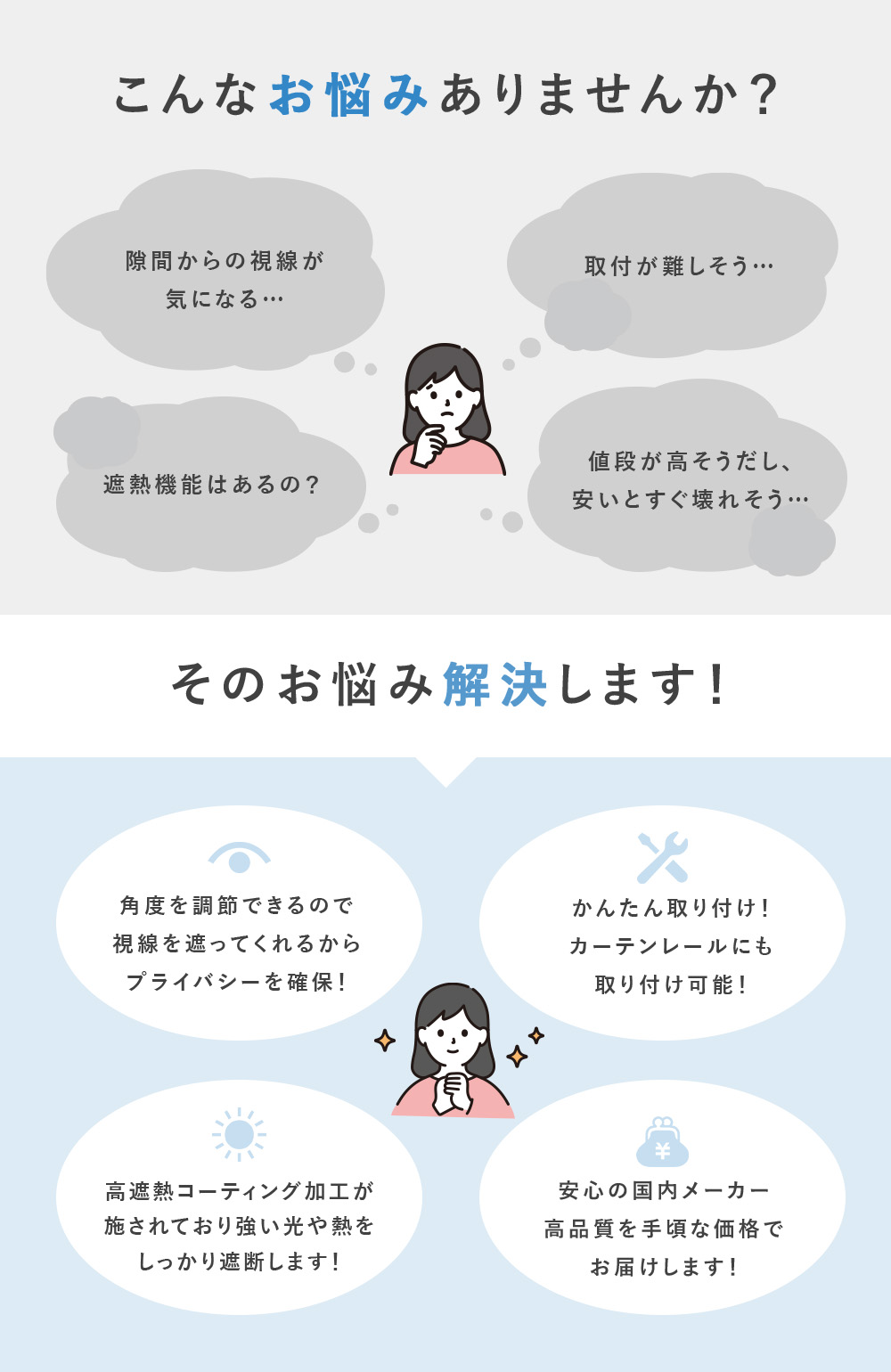 スラット(羽根)の角度を調節することにより、光量だけでなく外からの視線を遮ることができます。 角度によって光や風を取り込みながらも視線をシャットアウトできるので、プライバシーの確保や防犯対策にも有効です。
