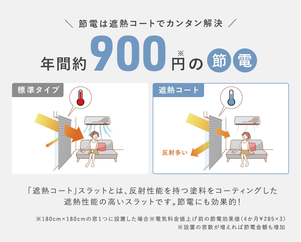 遮熱機能を備えたスラットを選ぶことで、夏の暑さからお部屋を守ることができます。 遮熱タイプのアルミブラインドは、スラットに特殊なコーティングを施すことで、太陽光に含まれる熱エネルギーを反射します。これにより、室内への熱の侵入を大幅に抑え、冷房効率をアップ。電気代の節約にもつながります。