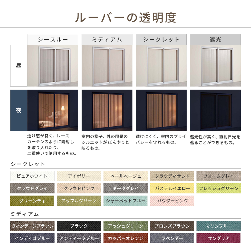 ルーバーの色によって、透け感が異なります。淡色はあまり透けず、濃色は透け感が強くなります。
