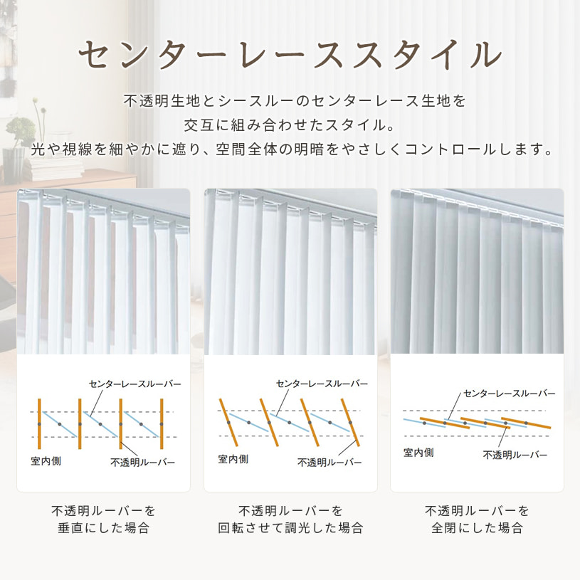 不透明なルーバーと、シースルー(レース)ルーバーを交互に組み合わせることで、よりカーテンに近い感覚で光の調整をすることができます。