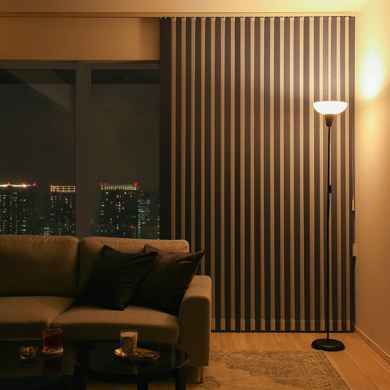 ウィスキーと香ばしくローストしたナッツ、そして美しい夜景。部屋のメインライトを消し、間接照明のスイッチを入れたら、オフタイムがスタート。バーチカルブラインドのスタイリッシュなシルエットが、大切な癒しの時間をよりブーストしてくれる。