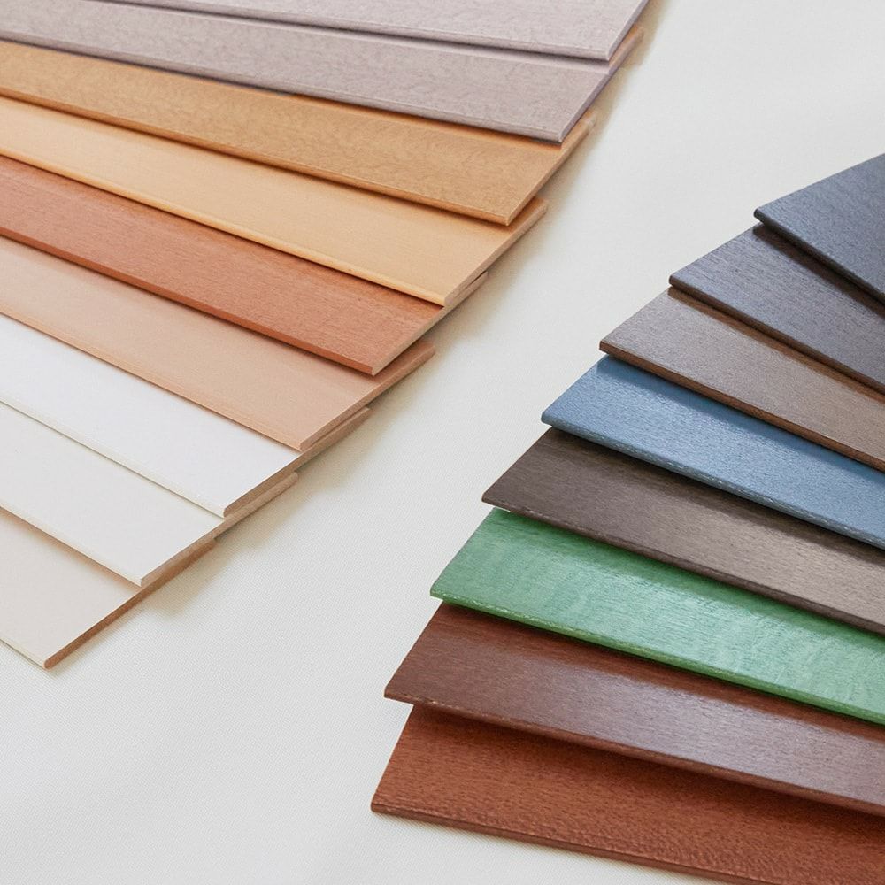 右上から、ブラック、ダークブラウン、ダークオーク、インディゴウォッシュ、アッシュグレイ、セージセピアブラウン、ミディアムダーク重厚感を楽しめるブラウン系や、ナチュラルな印象に仕上るホワイト系カラーを中心にした17色のラインナップ。 選べる楽しさもクレールならではのブラインドです。