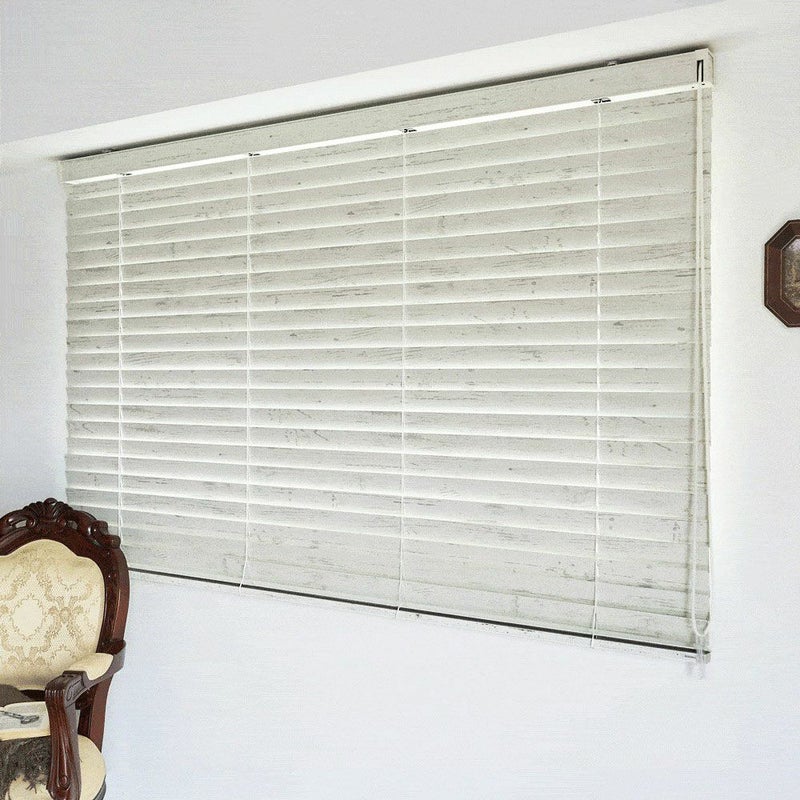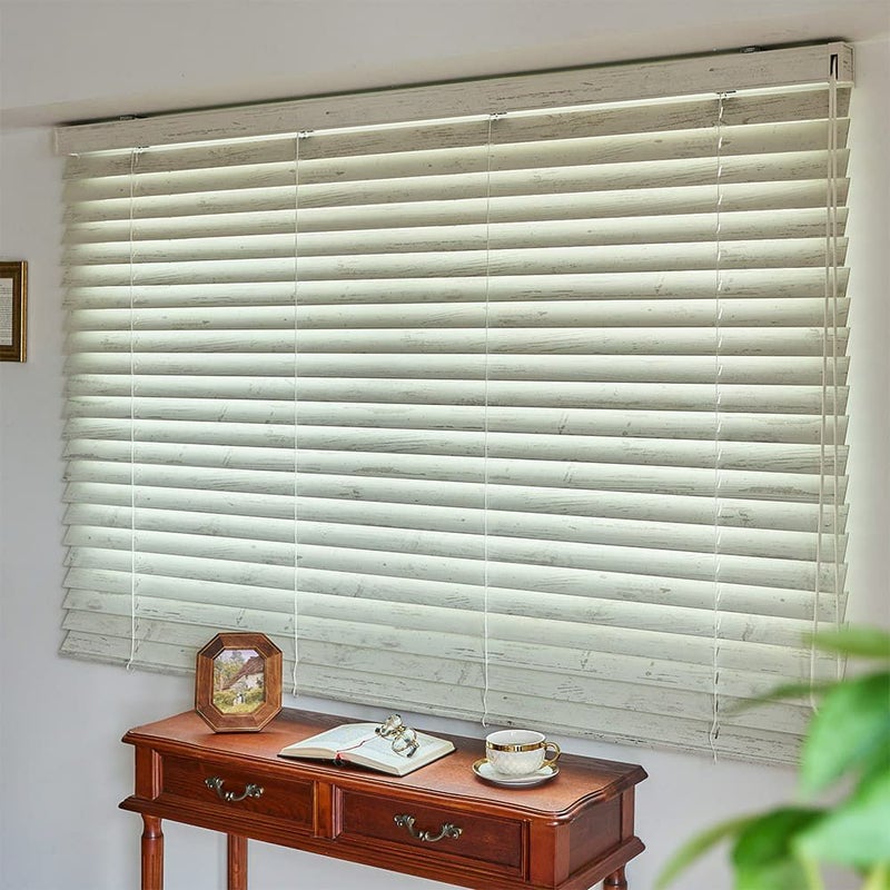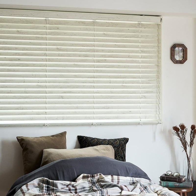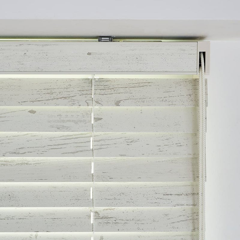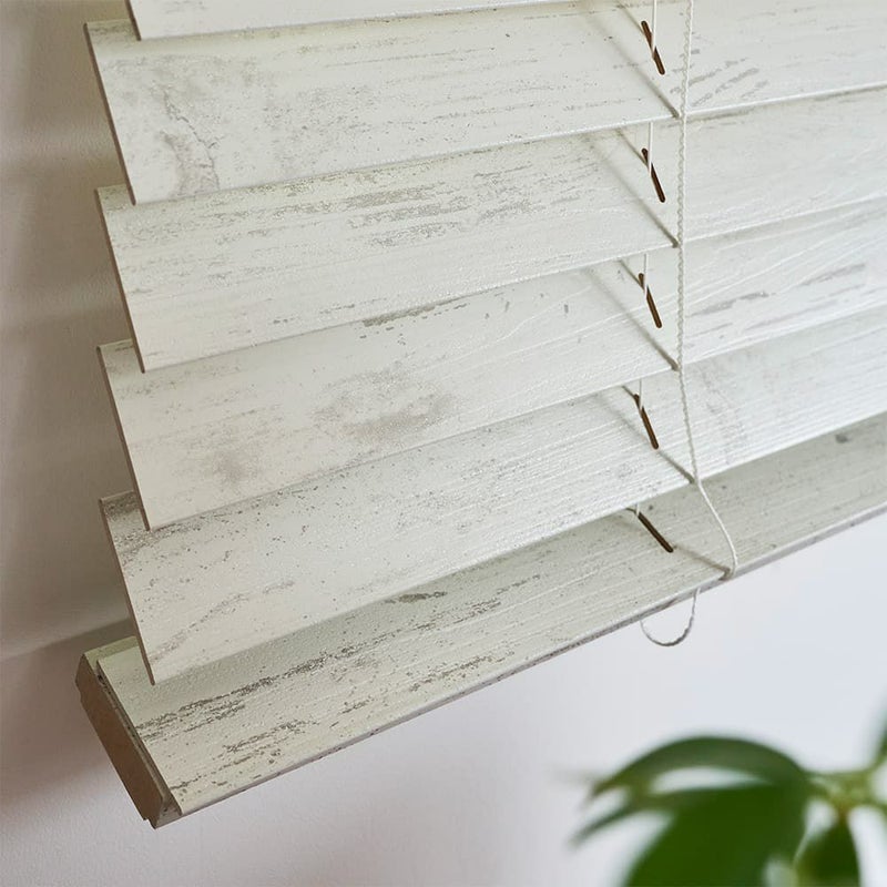 木目が見えるようにペイントを薄くほどこし、表面はツヤを抑えたオイル仕上げの天然木。素朴でナチュラルな雰囲気を演出しています。英国の美しい古城を想わす、シャビーでスタイリッシュなウッドブラインドです。