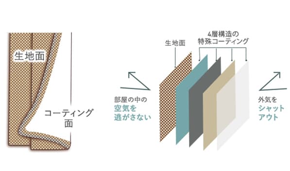 生地の裏に3枚のアクリル樹脂コーティング加工を行い、表地と合わせて4層となるカーテンです。表地の次に来るアクリル樹脂を白色にしたことで、生地の表面は黒ずむことなく発色の良さをそのままキープしてくれるのが特徴です。真っ白な生地でも白さがくすむことなく、真っ白な防音カーテンが可能です。
