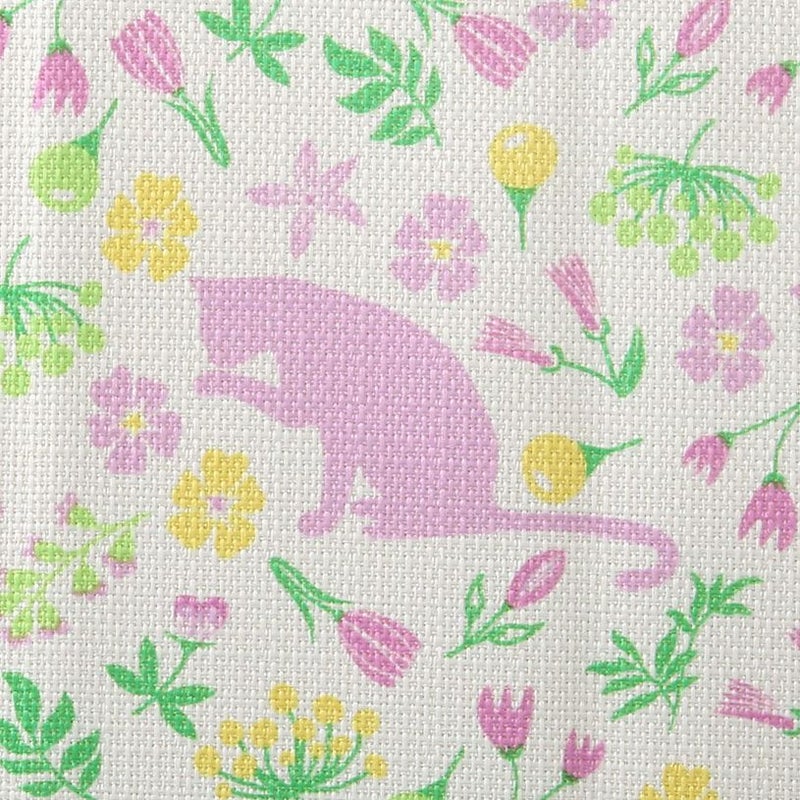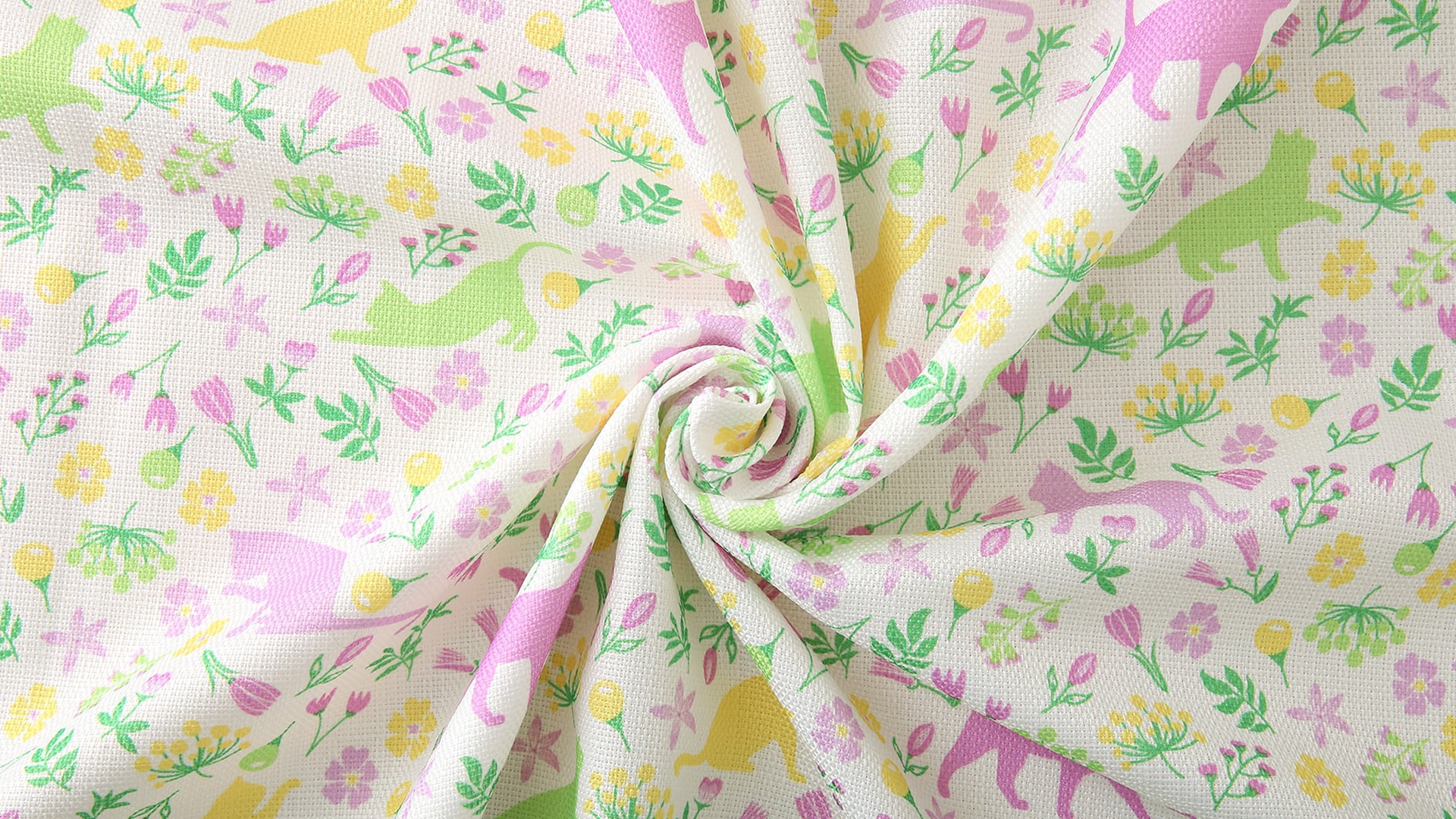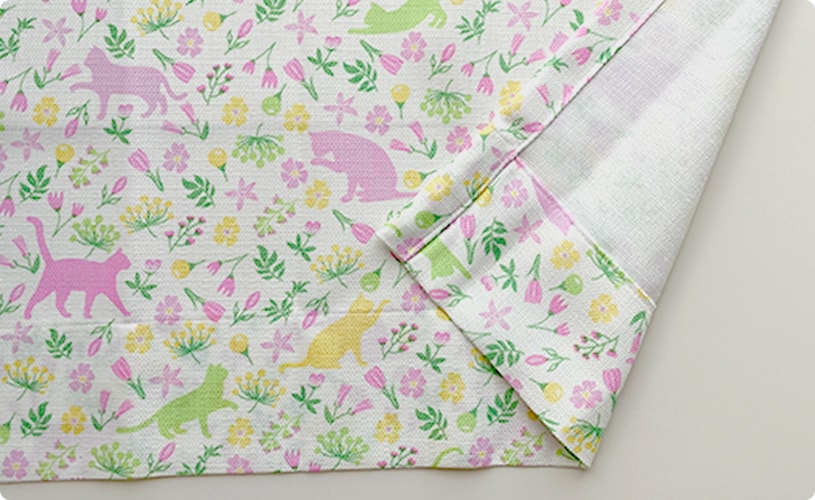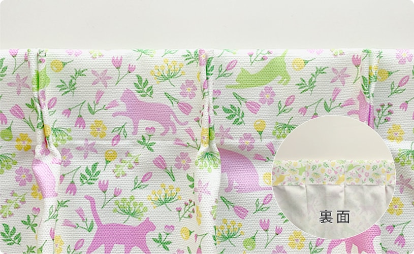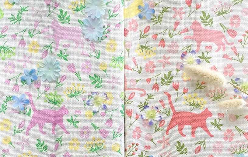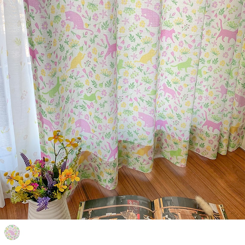 柔らかな優しい色味のフラワーガーデン。猫の兄弟もお花の色に染まってカーテンの中で遊んでいます。