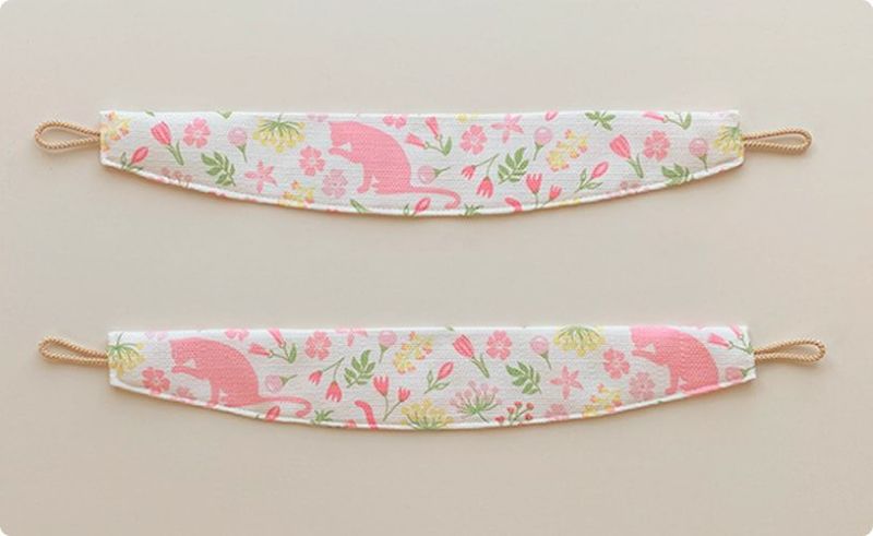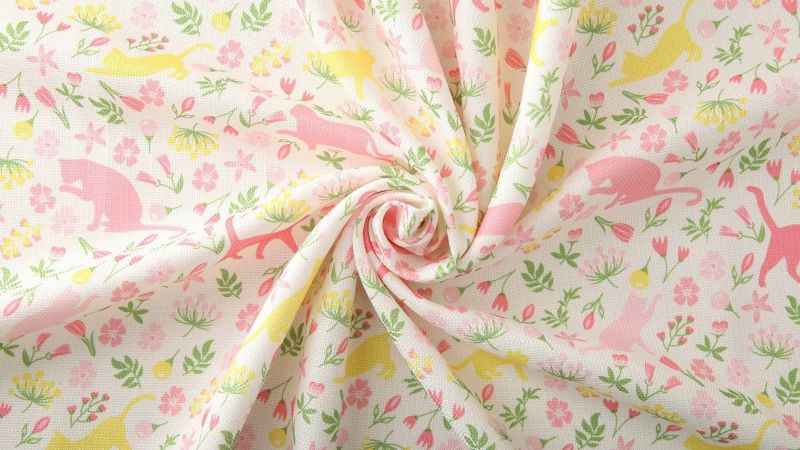 柔らかな優しい色味のフラワーガーデン。猫の兄弟もお花の色に染まってカーテンの中で遊んでいます。