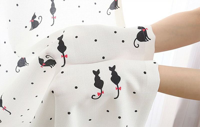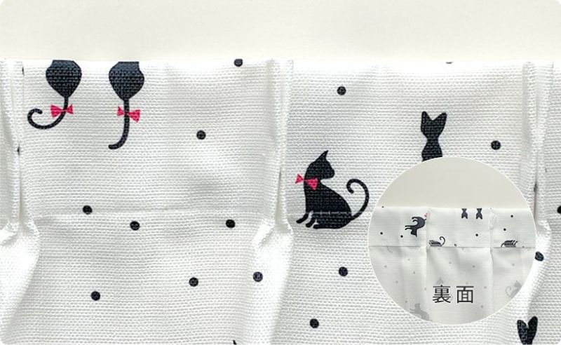 真っ白なベース生地に、ドットの模様と可愛い黒猫のシピが描かれているカーテン。