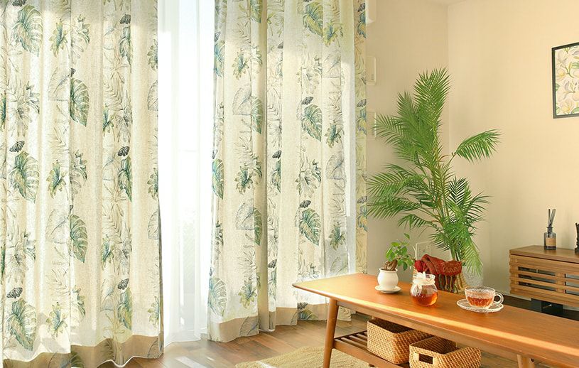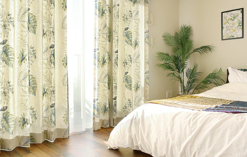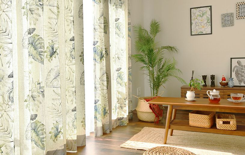 そこに、目を引く鮮やかさの刺繍カーテンで窓辺を彩れば、あっという間にハワイの風を感じるトータルコーディネートの完成です。