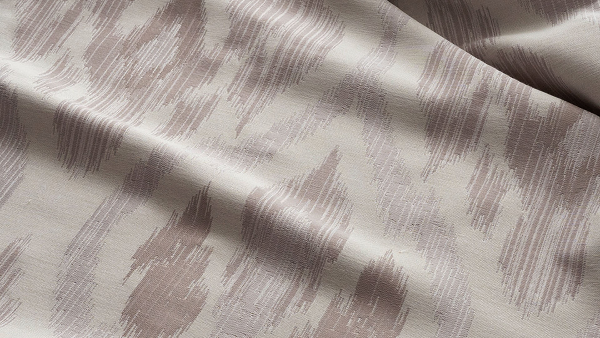 大胆なオーナメント柄でありながら、絣(かすり)で表現された繊細さと、奥行きのある趣を醸し出すデザイン。ヒダのないフラット仕様のカーテンが、大きめな柄を最大限に引き出します。縫製仕様とも好相性な、ダイナミックな一枚。