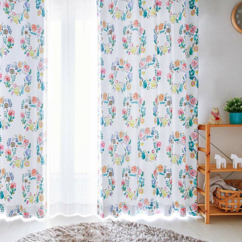 カラフルだけどどこか柔らかく、陽だまりのような温かさを持たせるために、花や小鳥たちを油絵や水彩画タッチで描くことにこだわった当店オリジナルデザイン。北欧をイメージさせてくれるブルー×イエロー、マルチカラーの色使いと一つ一つのオブジェクトにこだわりが詰まったカーテンです。