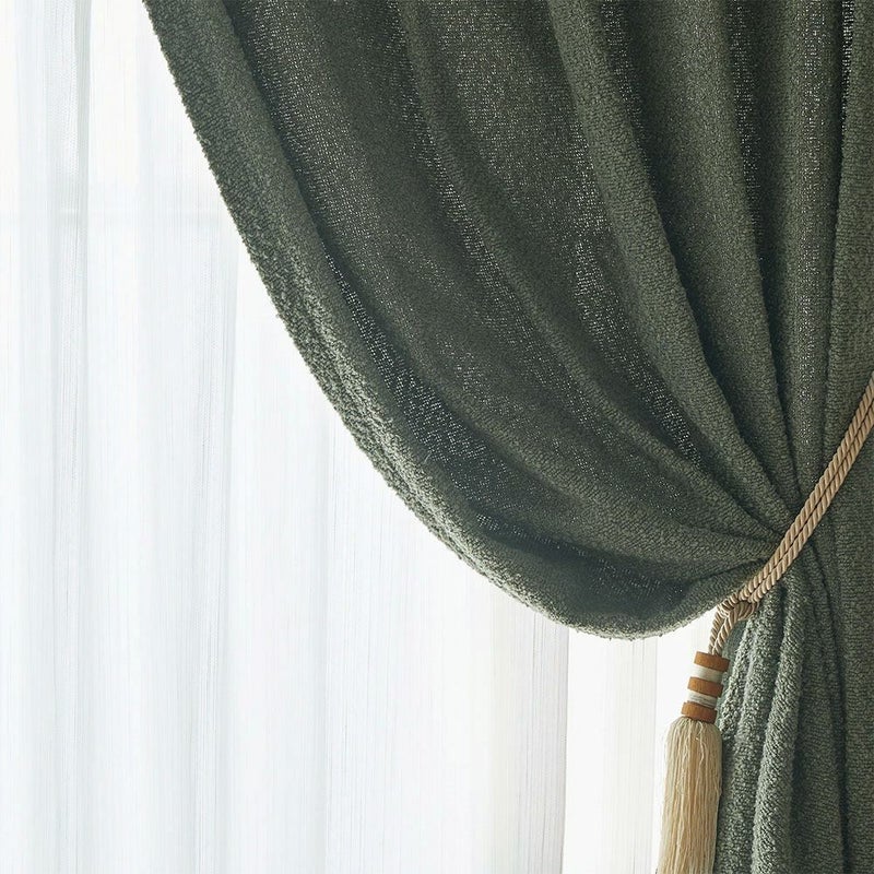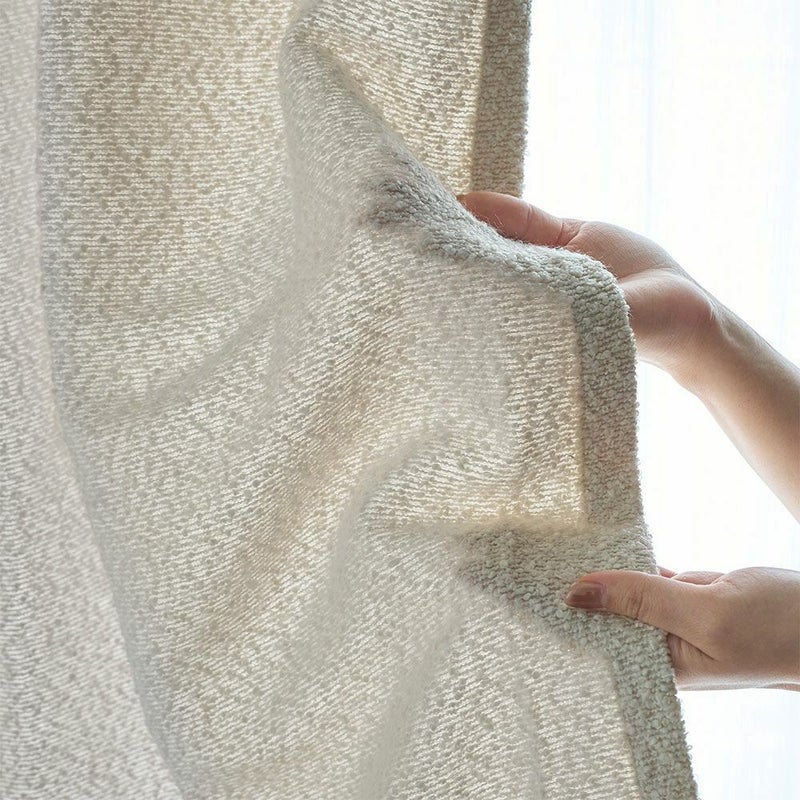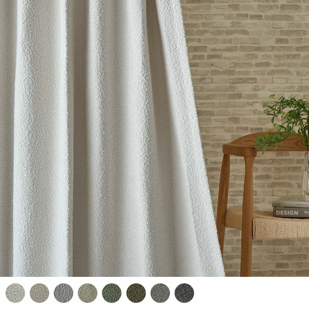 表面に小さな輪や結び目が浮かぶブークレ素材は、触れた瞬間に感じる柔らかさとぬくもりが特長です。独特の凹凸感が窓辺に上品な表情を作り、非遮光仕様だからやわらかな光を取り込みます。北欧ナチュラルな家具や小物とのコーディネートもしやすく、日々の暮らしにそっと心地よいアクセントを添えてくれる、温かみのある1枚です。