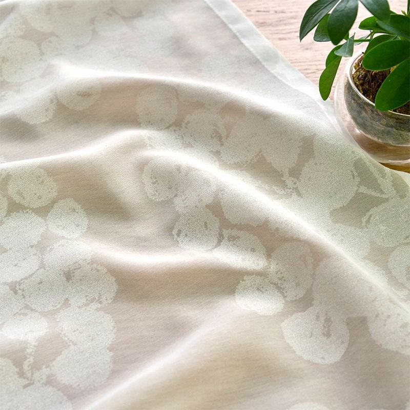 うっすらと光を通す、柔らかなボイル生地。そこに白のプリントを乗せることで、アジサイ模様がほのかに浮かび上がる仕立てになっています。<レースフロート>は、ただのレースではなく、手描きのやさしさと透け感のバランスを大切にした1枚。ナチュラルな風合いの中に、しっかりと“アート”を感じられる質感です。
