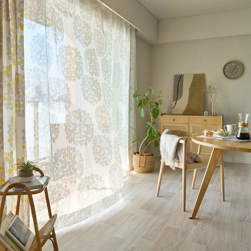 同じテキスタイルで仕立てた<レースフロート>と<フロート>の組み合わせは、窓辺に統一感と奥行きをもたらします。やわらかな陽の光に透けるアジサイ柄レースカーテンと、天然素材のしっとりとしたドレープカーテンが織りなす調和が、北欧らしいナチュラルな空間を演出。お気に入りのインテリアが、もっと心地よく、自分らしい空間に。