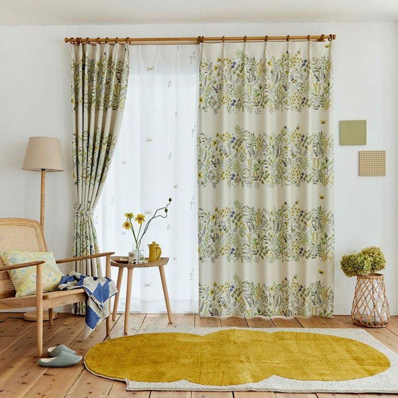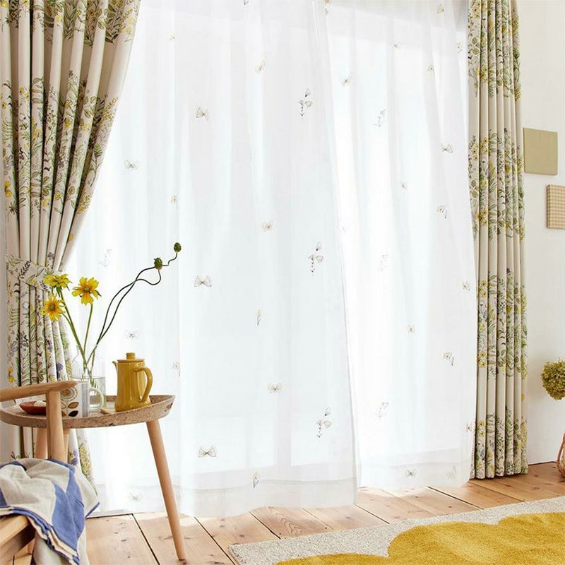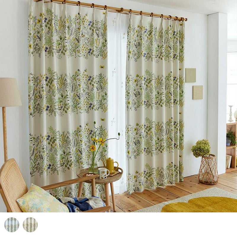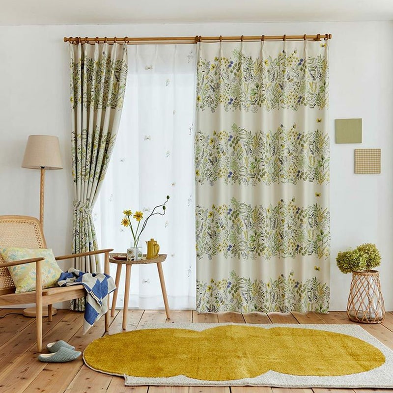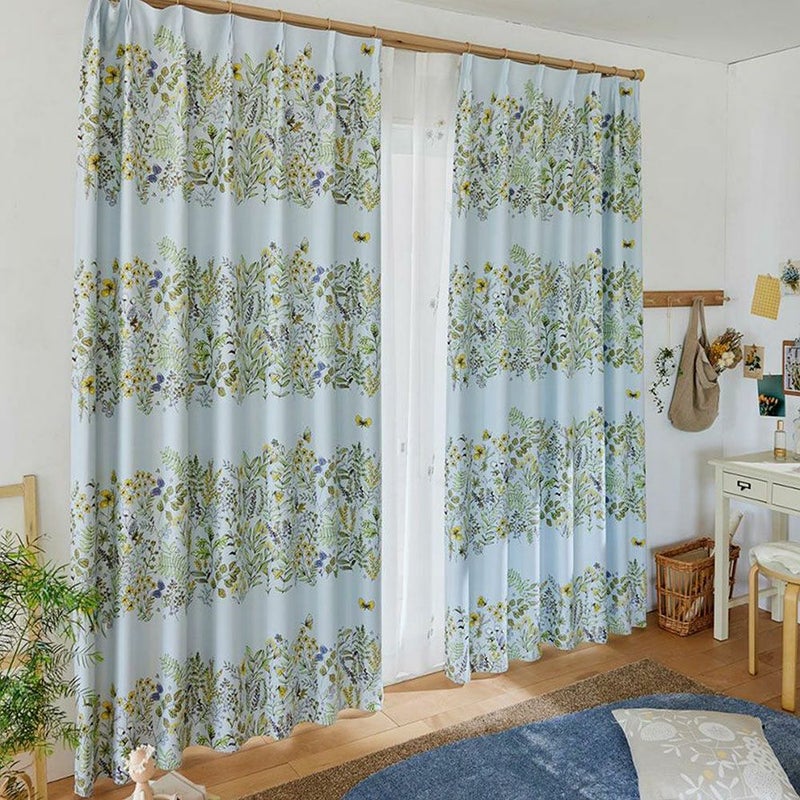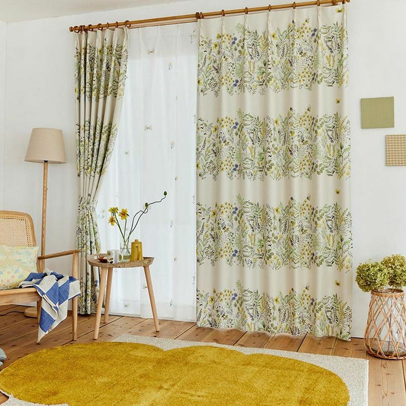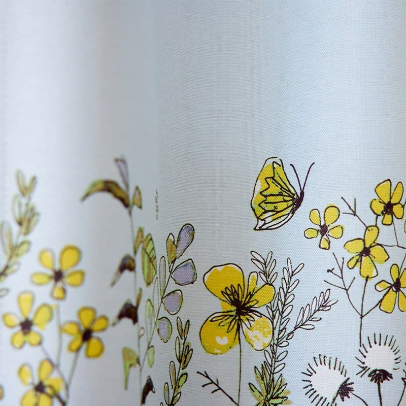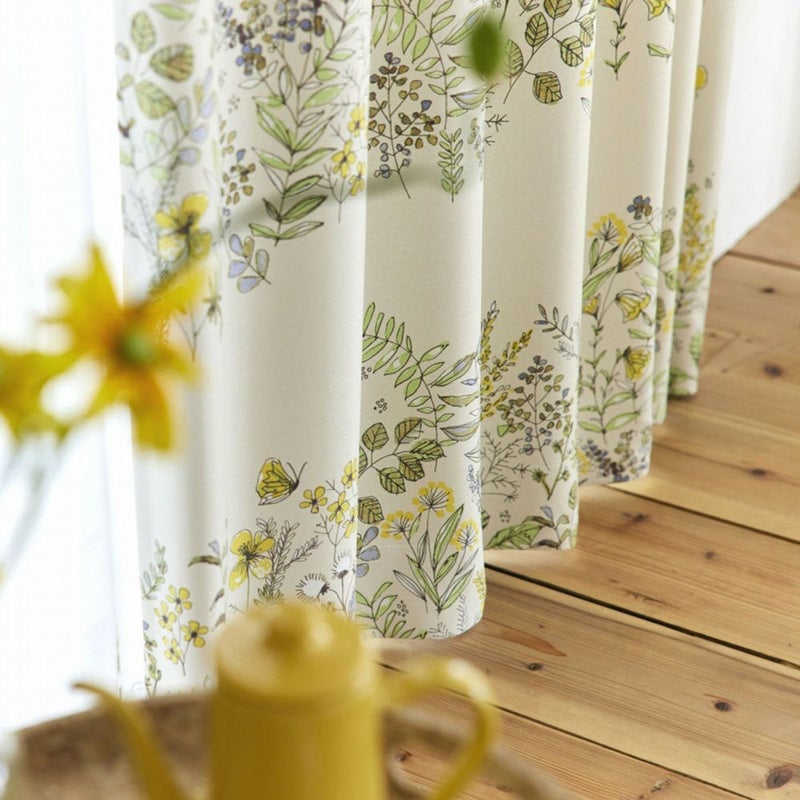 カジュアルで優しい雰囲気を演出する太めのボーダーデザイン。そんなお洒落なボーダーの正体は、道ばたに咲く草花なんです。よく見てみると草花の周りを飛ぶ蝶も発見!道ばたに咲いている草花を摘んで花束にしたり、編んで花冠を作った子供の頃を思い出すようなデザインのカーテンです。まるでリビングで道草を楽しんでいるような気分に♪