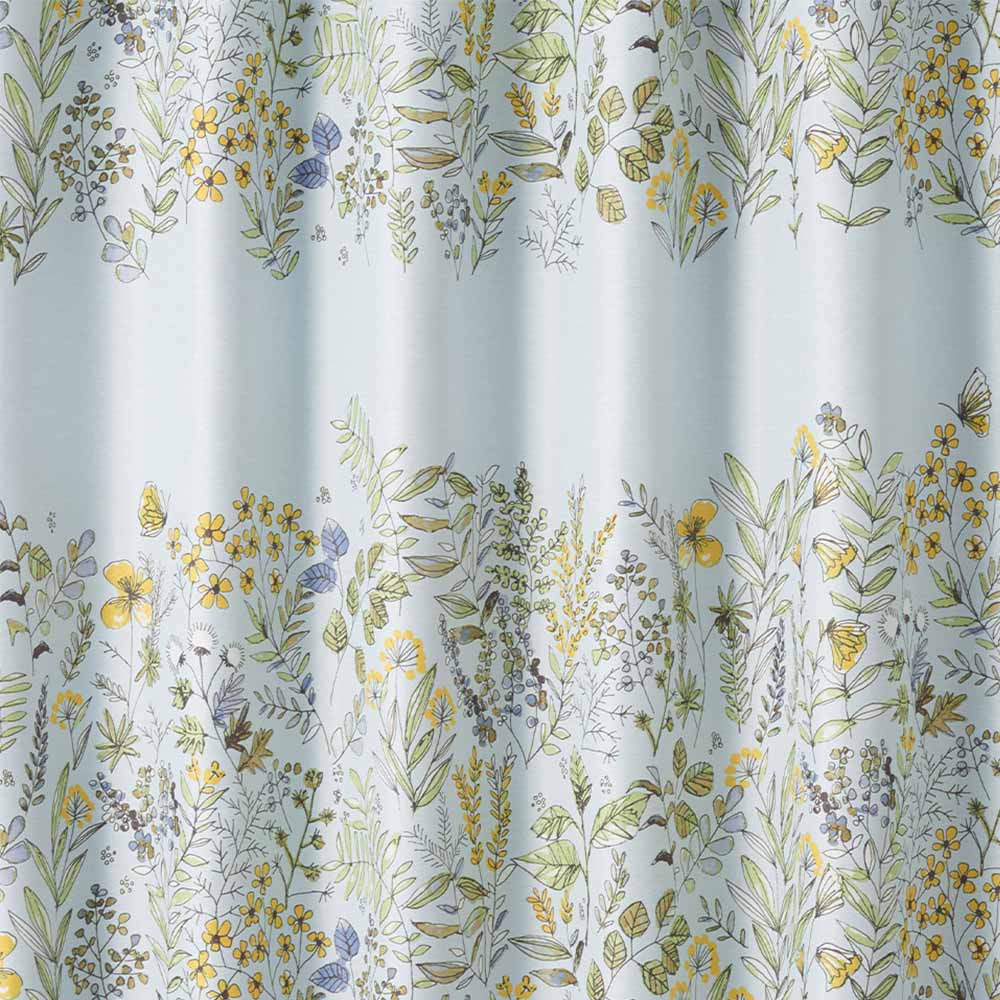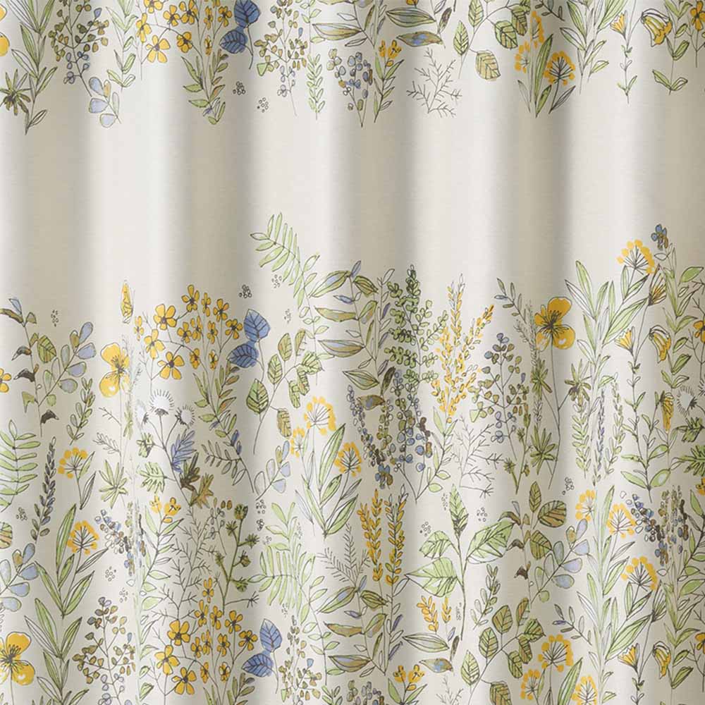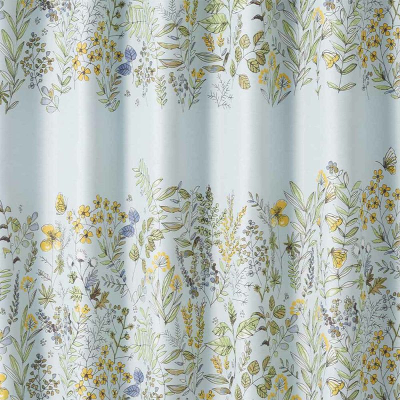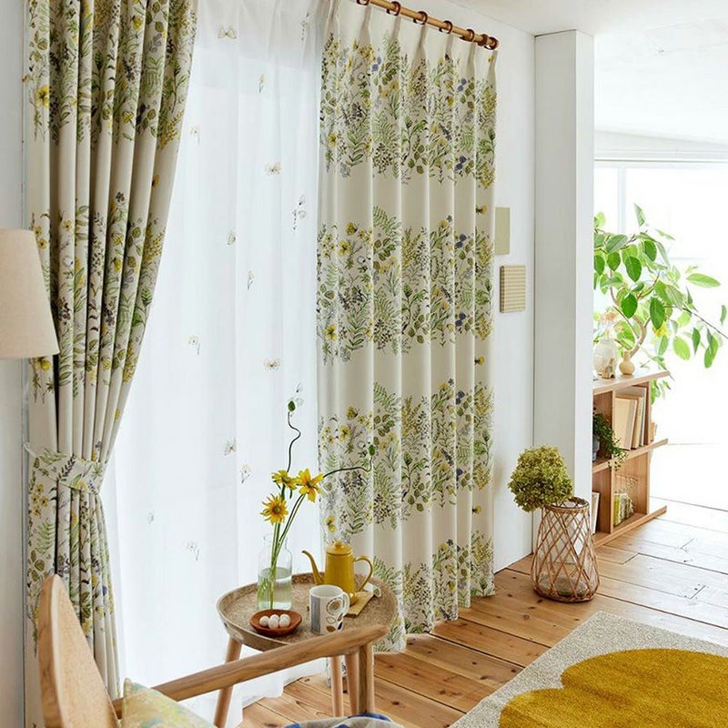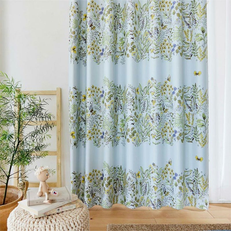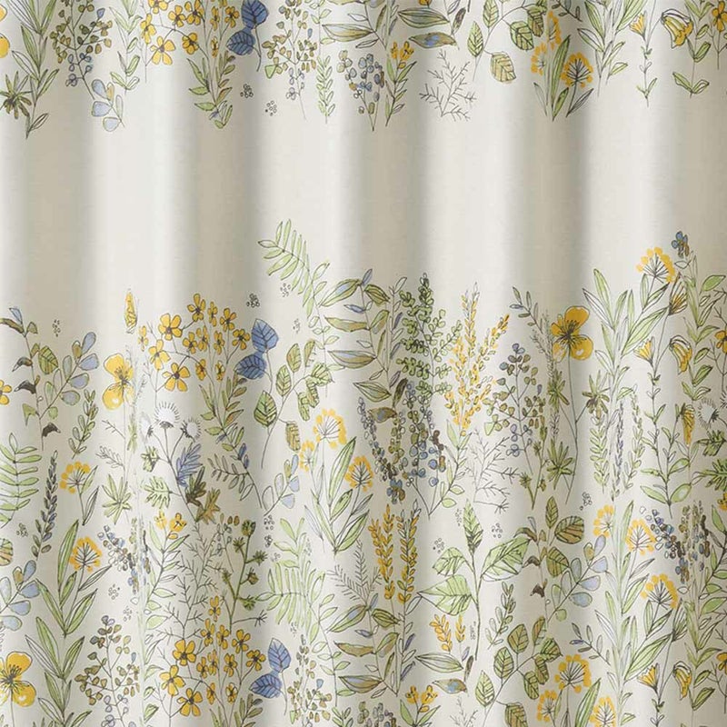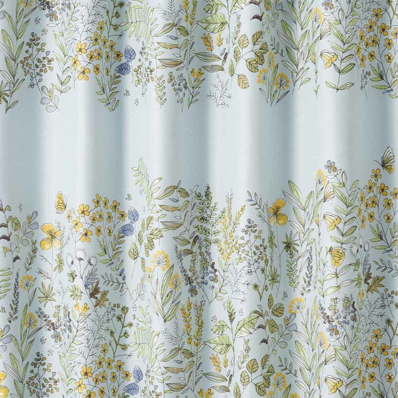 カジュアルで優しい雰囲気を演出する太めのボーダーデザイン。そんなお洒落なボーダーの正体は、道ばたに咲く草花なんです。よく見てみると草花の周りを飛ぶ蝶も発見!道ばたに咲いている草花を摘んで花束にしたり、編んで花冠を作った子供の頃を思い出すようなデザインのカーテンです。まるでリビングで道草を楽しんでいるような気分に♪