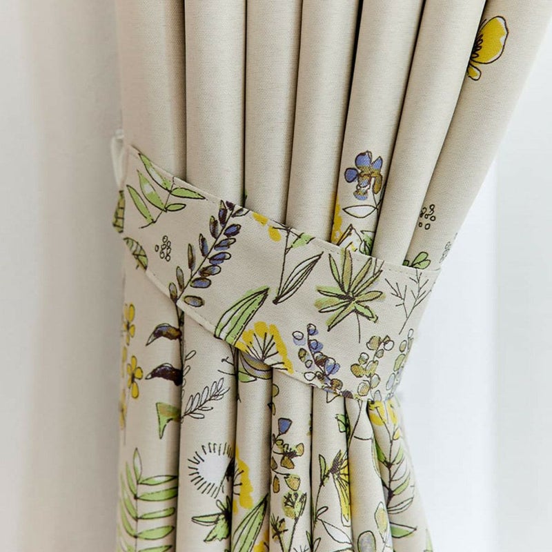 カーテンと同柄のタッセル付きだから細部まで可愛い♪カーテンを閉じている時だけでなく、開けて過ごすお昼の時間も「ミチクサ」の可愛らしさをお楽しみいただけます。