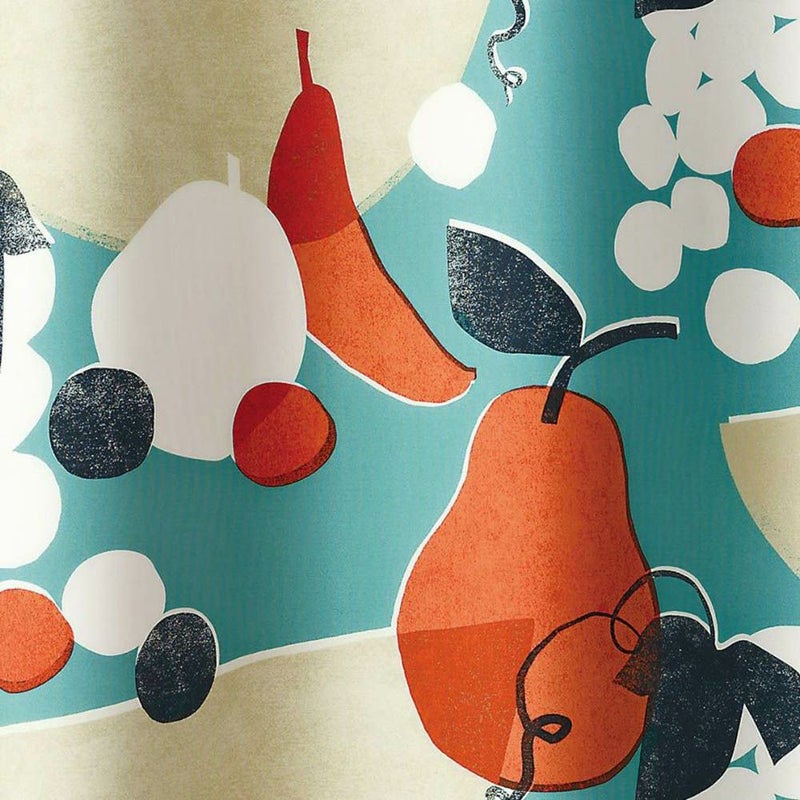 ころころと転がりだしそうなブドウと、大きな洋ナシがアクセント♪個性的なフルーツたちがリズミカルに散りばめられたデザインです。あれもこれも!と、思わず摘まみたくなっちゃいますよね。どこかレトロな雰囲気のカラーリングと、あえて出したかすれデザインや版ズレにあたたかさを感じます。