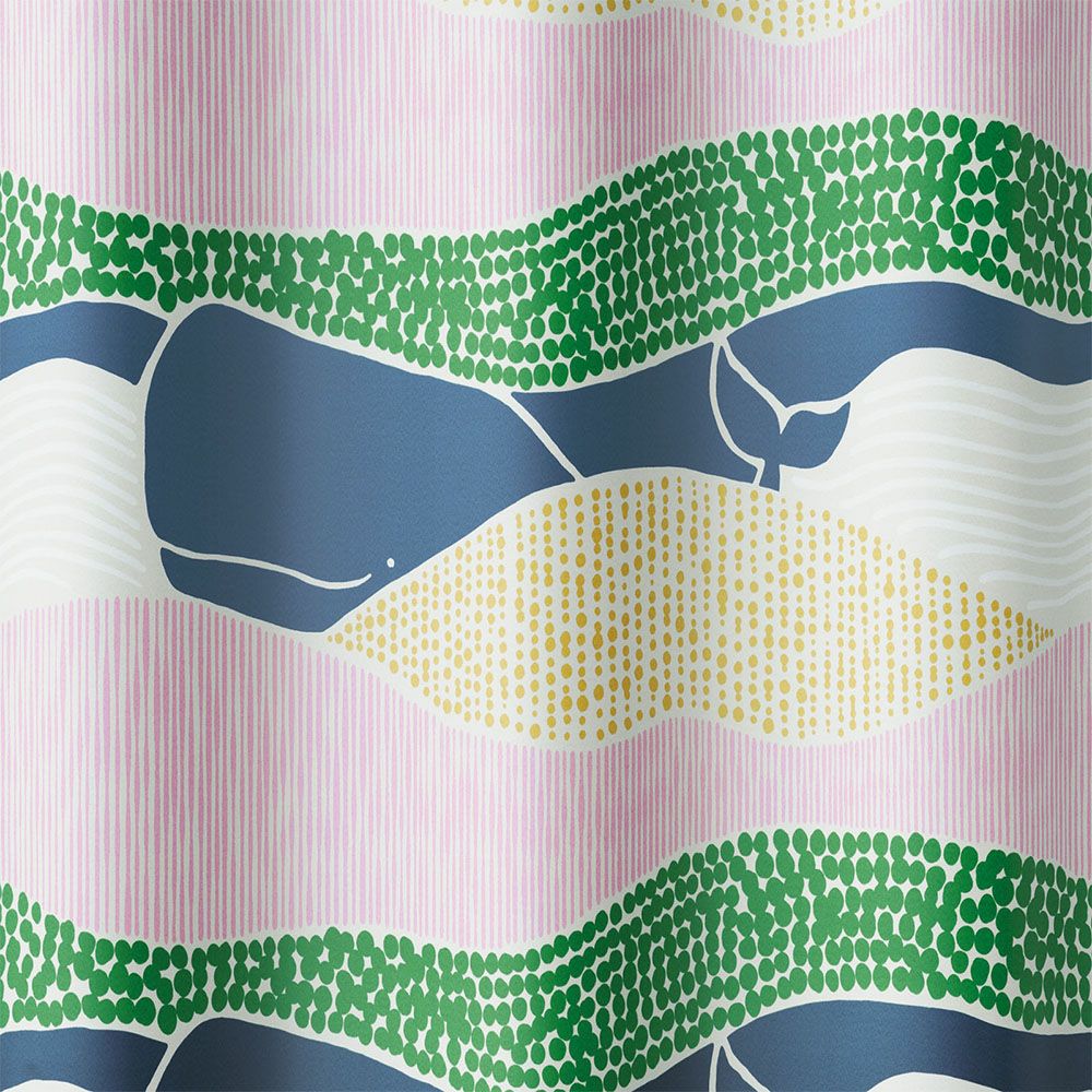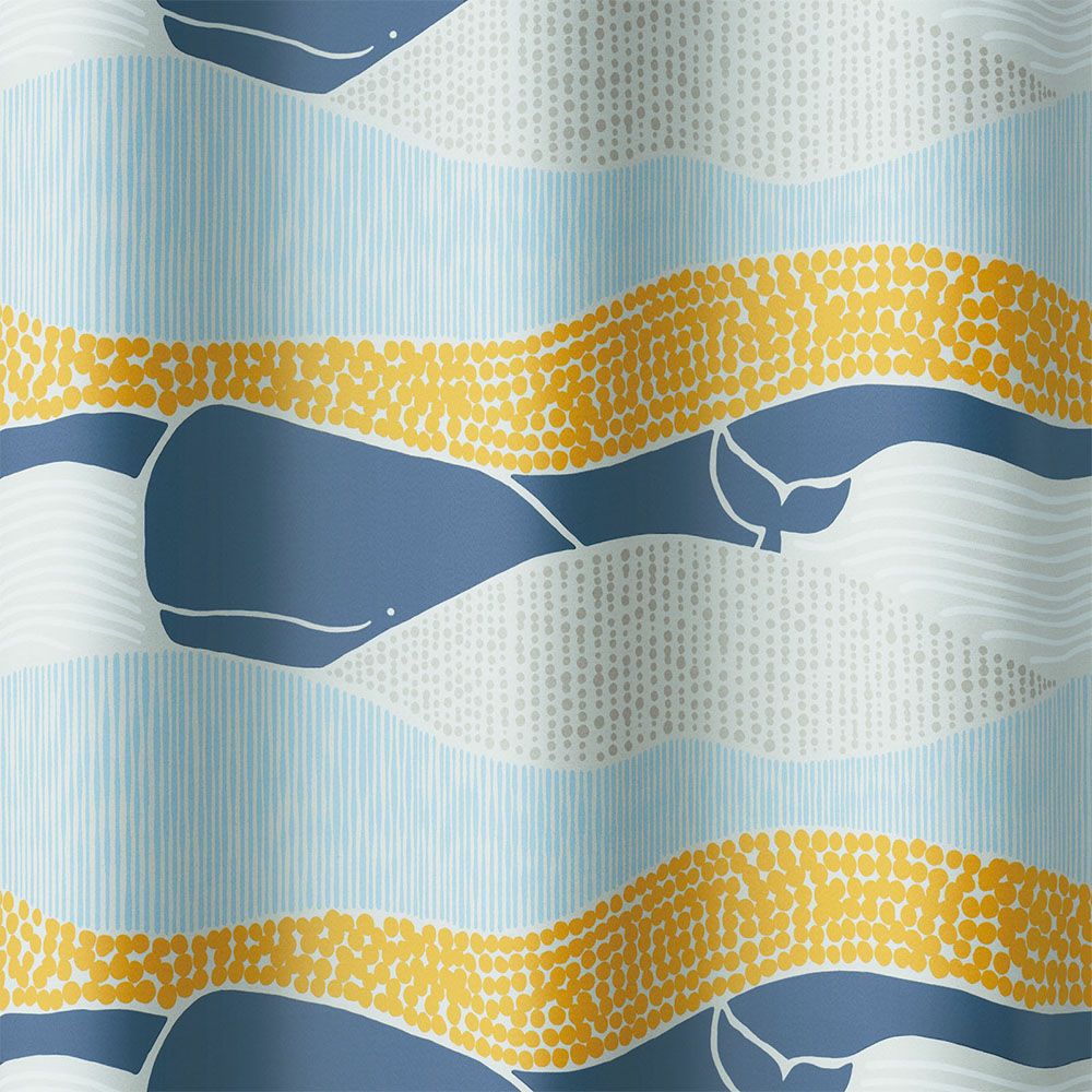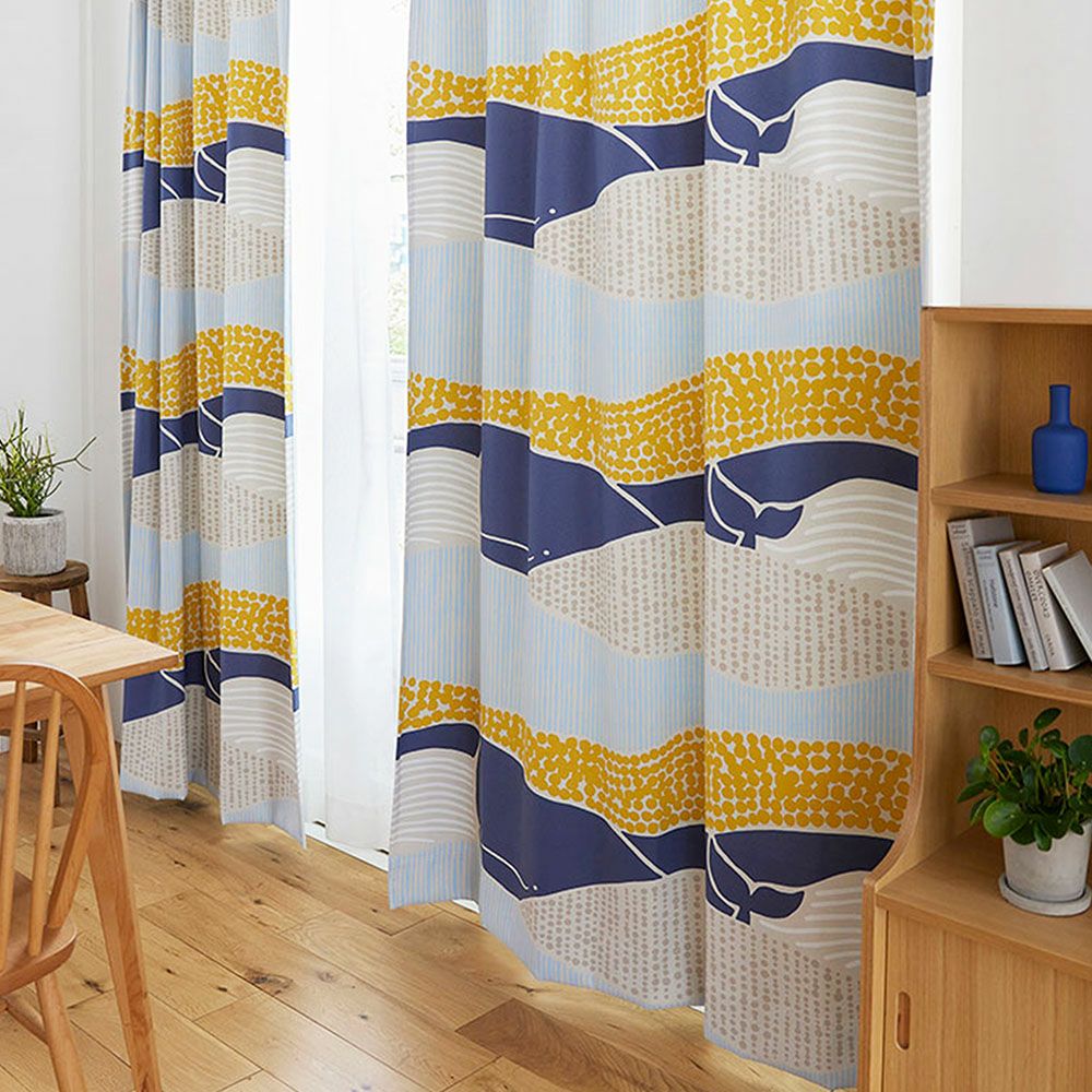 雄大な海をゆったりと泳ぐマッコウクジラの航海を描いた、遊び心満載の【デザインライフ】の遮光カーテン。
