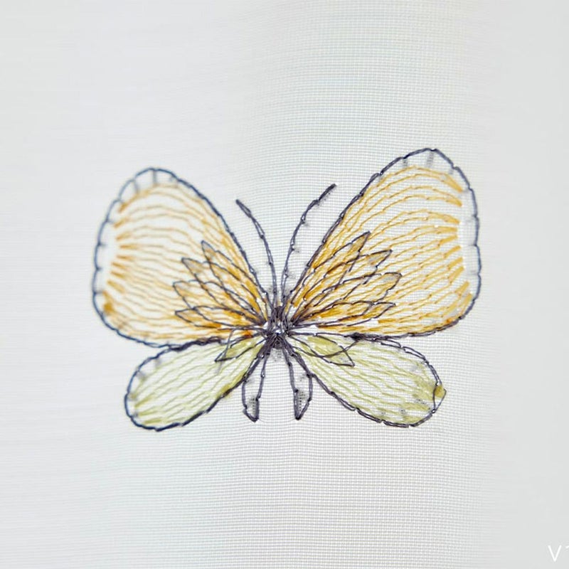 道端に咲いている小さな草花と、軽やかに舞う蝶たちを4色の刺繍糸で描きました。糸の重ね具合によって色の濃淡を表現し、生き物たちに動きを出した手書き風のデザインです。優しい色合いの刺繍糸が、ほっこりとした落ち着きのある雰囲気を演出してくれます。さらに、ボイルレースの柔らかい手触りからも「ミチクサボイル」の優しい雰囲気を感じられます。