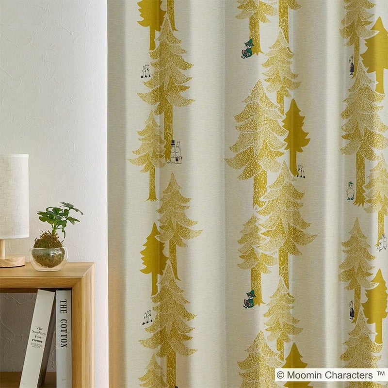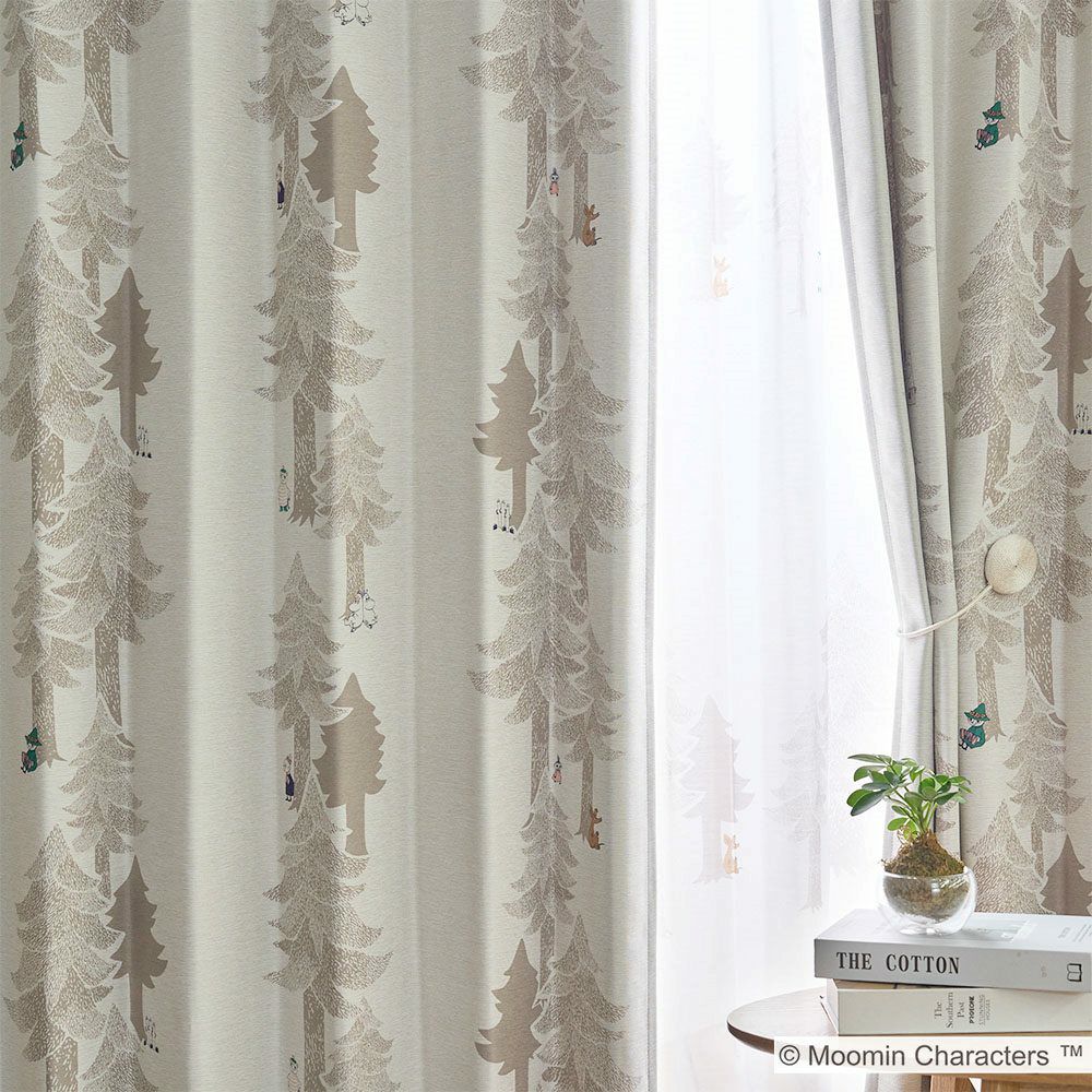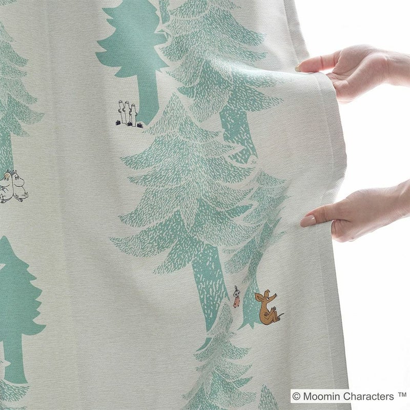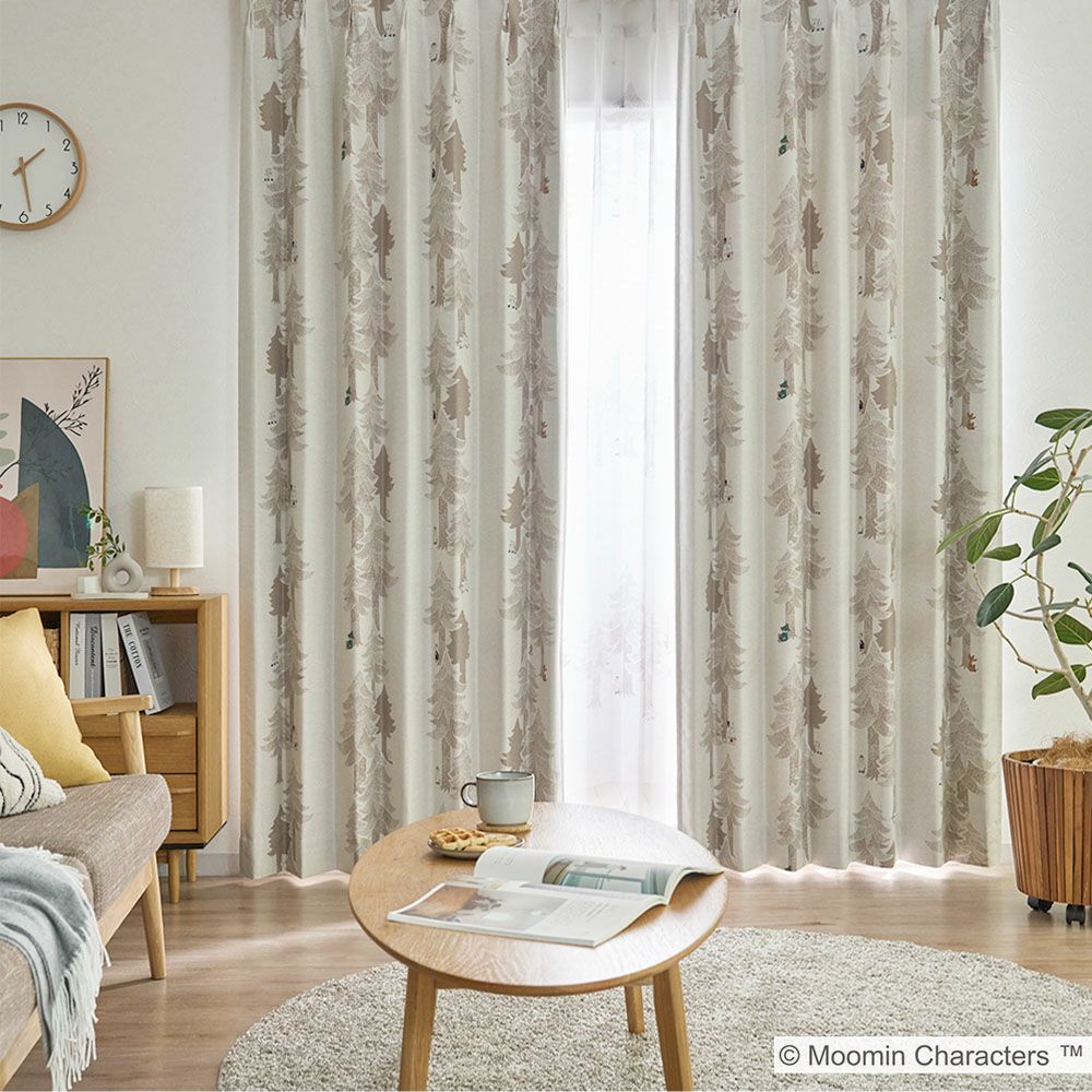 森で暮らす、ムーミンと仲間たちにほっこり。縦ストライプ状に並んだ北欧風の木立と、その間に覗くムーミン谷の仲間たちの姿が可愛らしい2級遮光ドレープカーテンです。