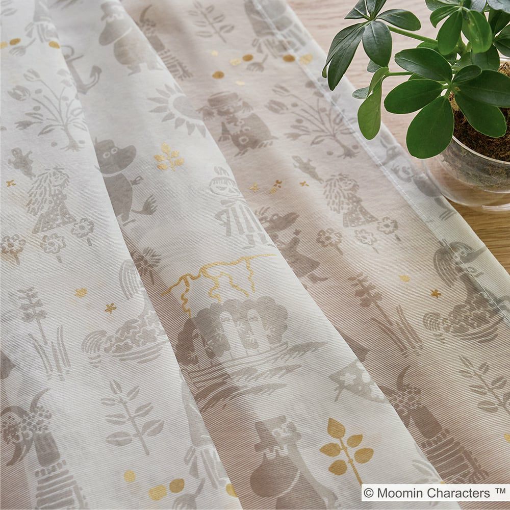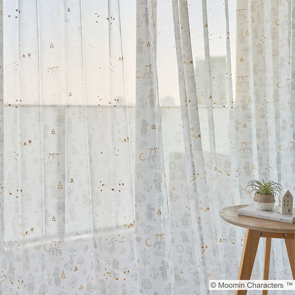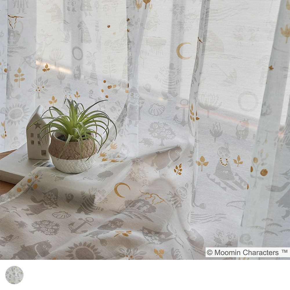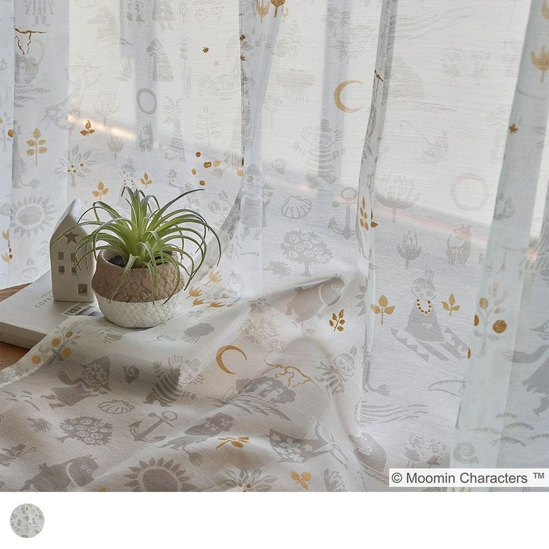 ドレープカーテン「ムーミン谷の地図」と合わせるとさらに世界観が深まり、北欧インテリアともマッチします。所々に散りばめられた金色のラメプリントがキラキラ輝くアクセントになる、可愛さもお洒落も兼ね備えたレースカーテンです。 -