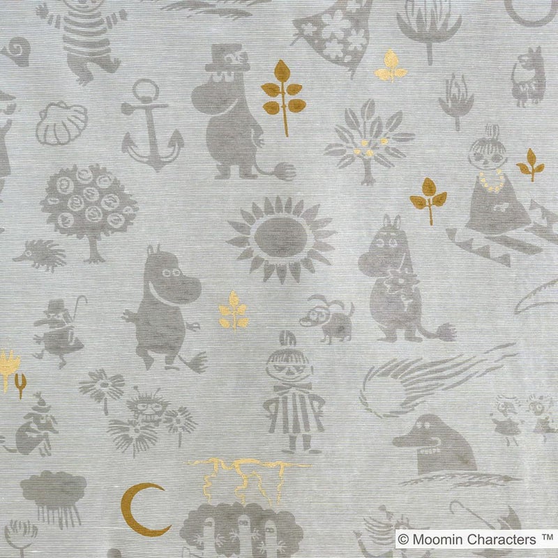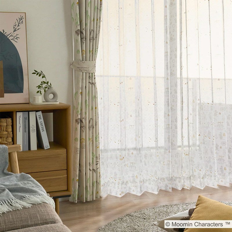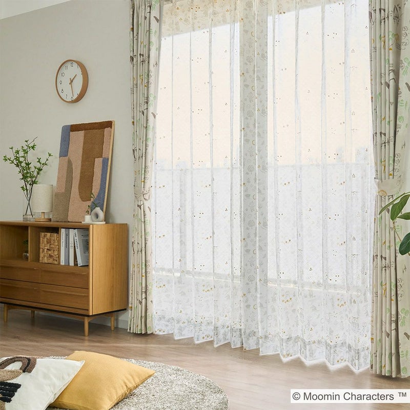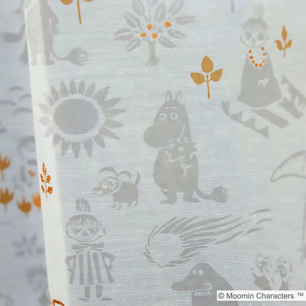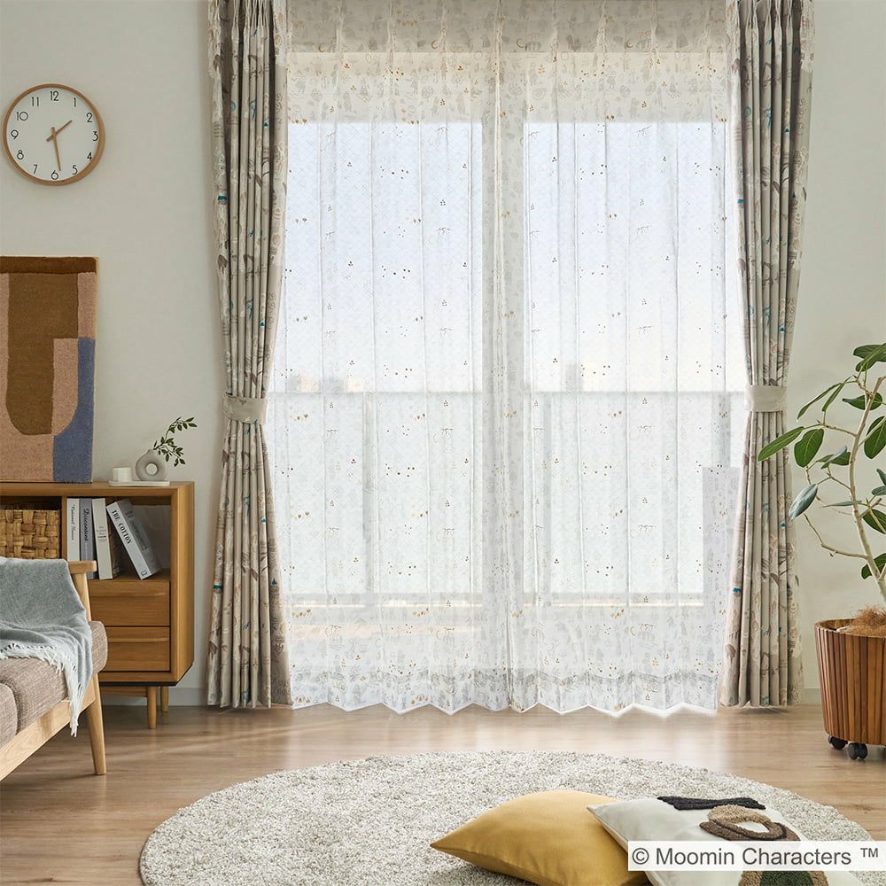 ドレープカーテン「ムーミン谷の地図」と合わせるとさらに世界観が深まり、北欧インテリアともマッチします。所々に散りばめられた金色のラメプリントがキラキラ輝くアクセントになる、可愛さもお洒落も兼ね備えたレースカーテンです。 -