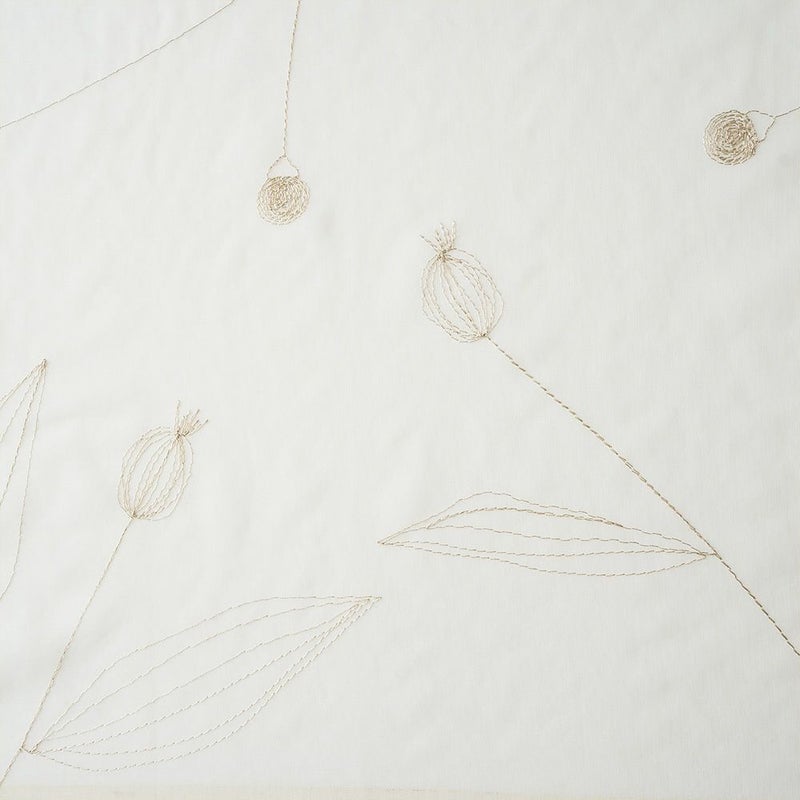 上へ上へと伸びるような植物を、手書きタッチの刺繍で表現しました。手書きのあたたかさを感じつつ、レース全面に施された刺繍からは贅沢な高級感も感じられます。全面に刺繍されながらも、ナチュラルなデザインなのでインテリアに馴染むところも魅力。