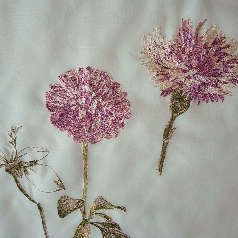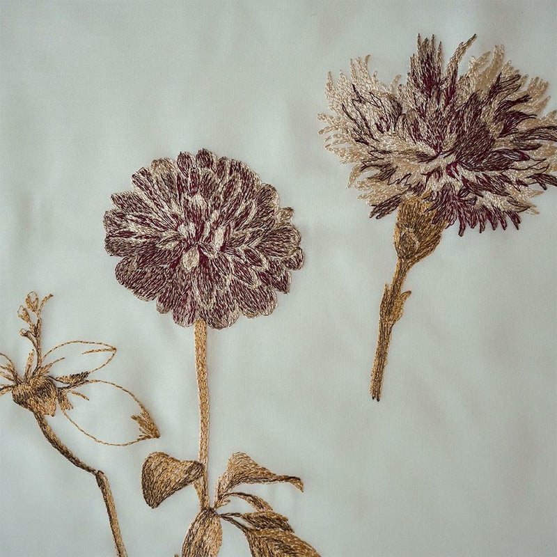 一針一針、花の姿に命を吹き込むように。繊細な糸で描かれた刺繍が、柔らかな生地に豊かな立体感を生み出します。アネモネの丸み、ダリアの華やぎ、野ばらの優しさ、カーネーションの揺らぎ。それぞれの花がふんわりと咲き誇り、空間に気品を添えます。