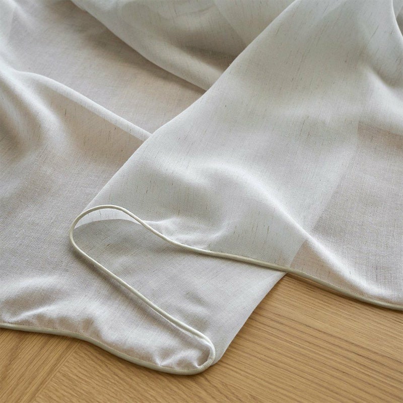 裾まで軽やかな印象になる、裾巻きロック加工を施しました。レースカーテンの柔らかい表情を、裾までたっぷりとお楽しみいただけます。風にそよそよと揺れる姿も、たまらなく愛おしい。