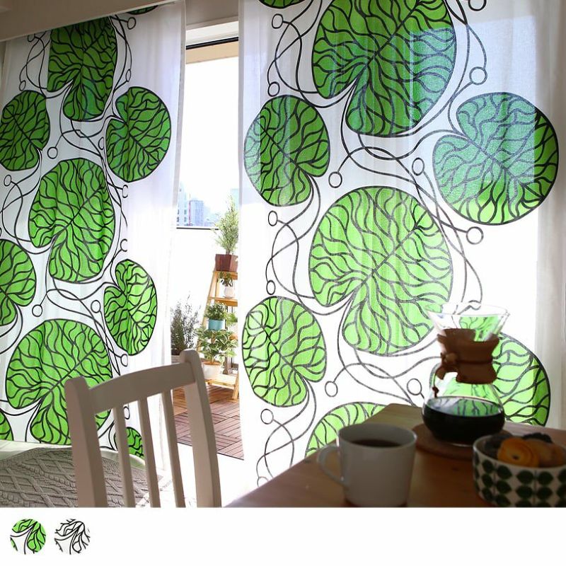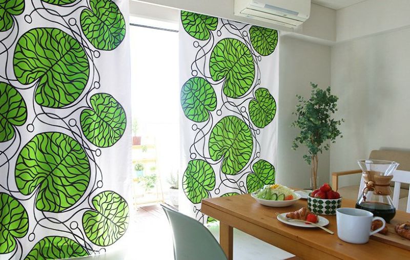 北欧を代表するテキスタイルブランド、marimekko(マリメッコ)の生地をカーテンに仕立てました。思い切った色使いと大胆なデザインは一度見て心に残り、気持ちをハッピー魅力にするつもりです。 br> ボットナは湖面から大きくた蓮の葉を大胆な大きさでプリントした、マリメッコの人気テキスタイル。 朝のバタバタした時間おわり、ホッと一息つくコーヒータイム。 窓からの陽射しも美しいその時間にピッタリのデザインです。