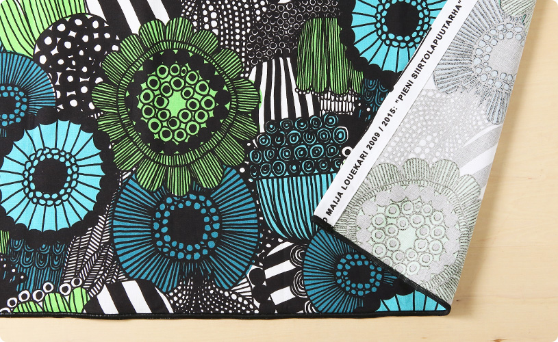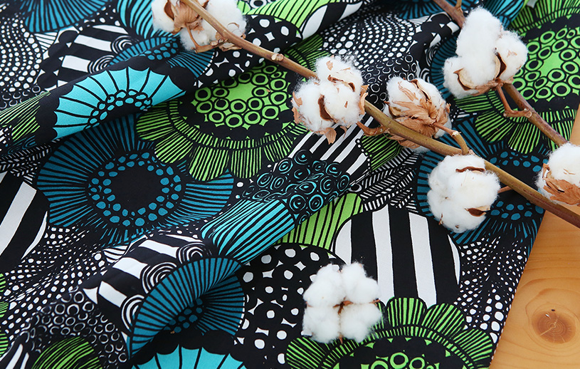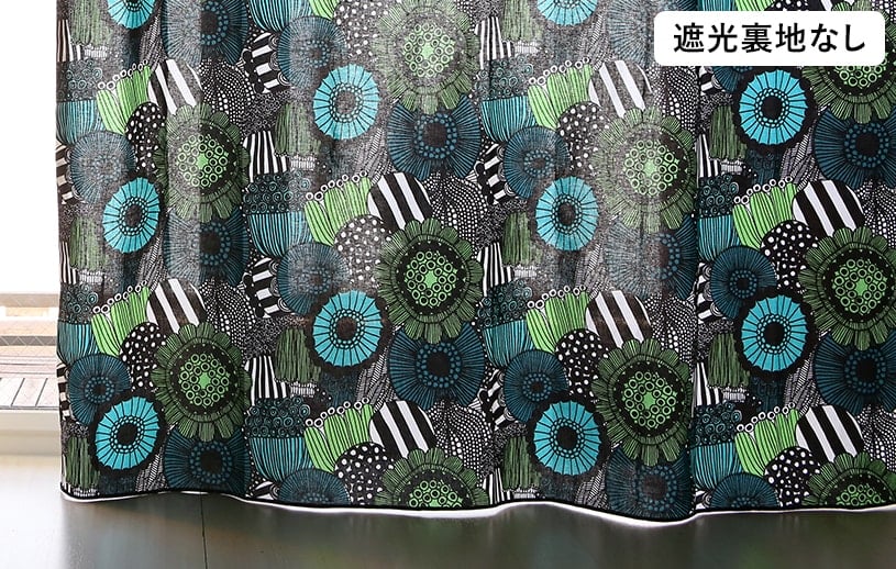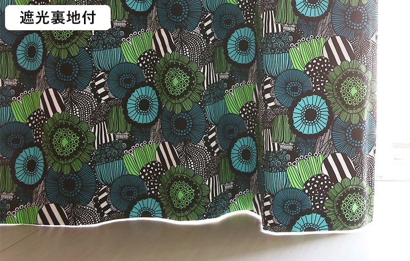 マリメッコのカーテン生地は全てコットン100%。北欧フィンランドより輸入し、マリメッコ独自の検査を行ったものを使用しています。柄のズレやインクのムラ、天然素材ならではの節や色糸の混入。きっとコットンの魅力に取りつかれた方は「そんなのたいしたことないわ」おっしゃると思いますが、こういったものも味と捉えていただき、天然繊維であるコットンの個性として楽しんで下さい。