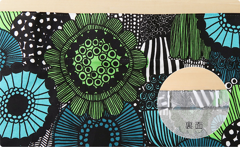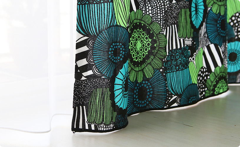 通常、裾は10cm程折り返してお仕立てしますが、マリメッコのカーテンはデザインをより楽しんでいただけるように、裾を糸で包む「巻きロック加工」でお仕立てします。陽に透けた時に、一番美しく見えるように工夫したオーダーカーテンならではのお仕立てです。(裏地付きの裾は遮光性を高めるため、10cmの折り返しになります)
