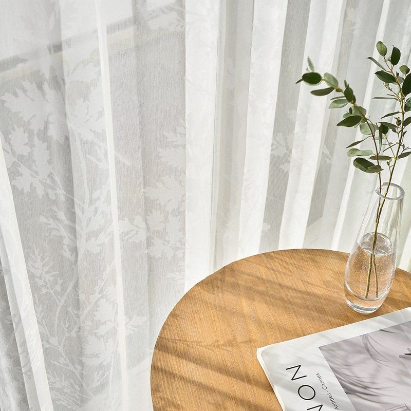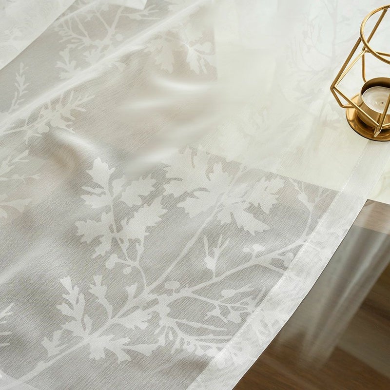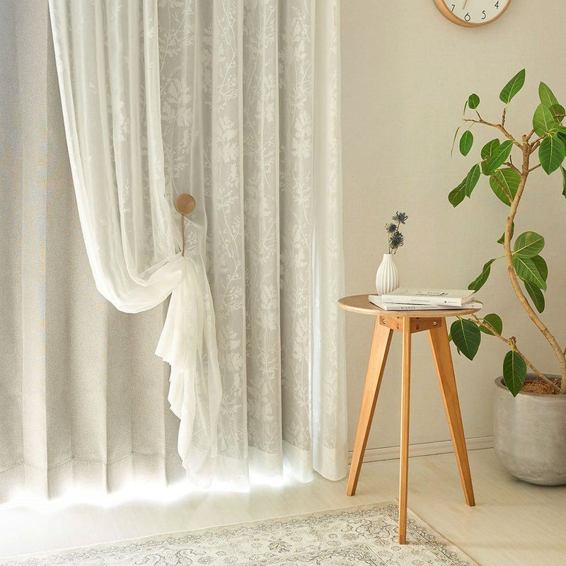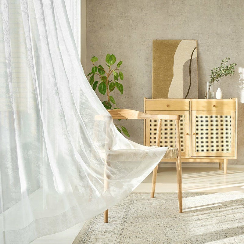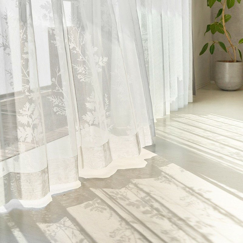 外から差し込む、眩しいほどの光を受け止めたレースカーテンと、床に映し出される幻想的なヒイラギのシルエット。オパールレースカーテンだからこそ叶えられる幻想的な空間は、私たちの心を魅了します。