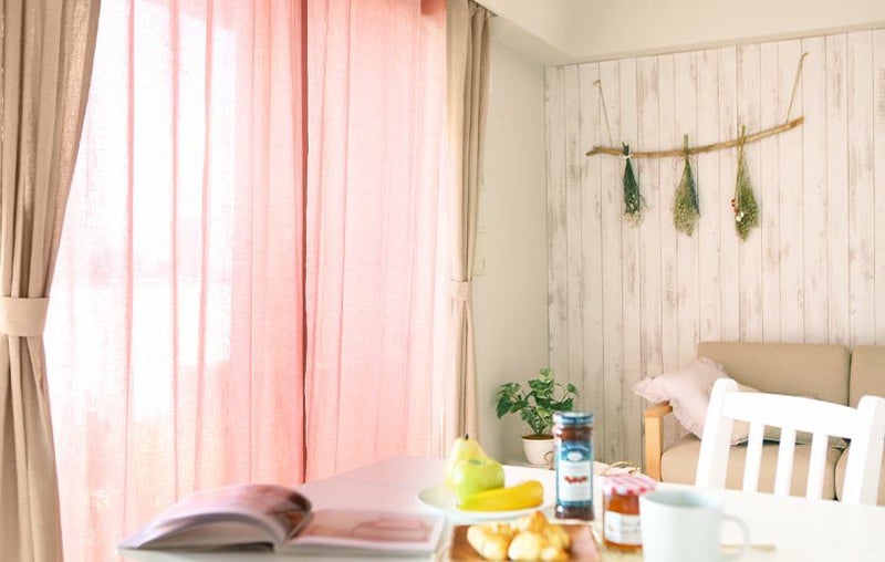 シャーベットカラーの天然素材カーテンで可愛らしいお部屋に。
