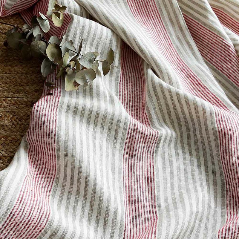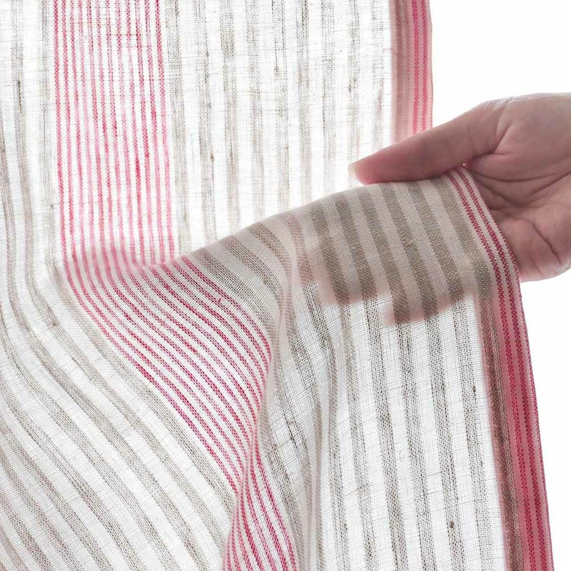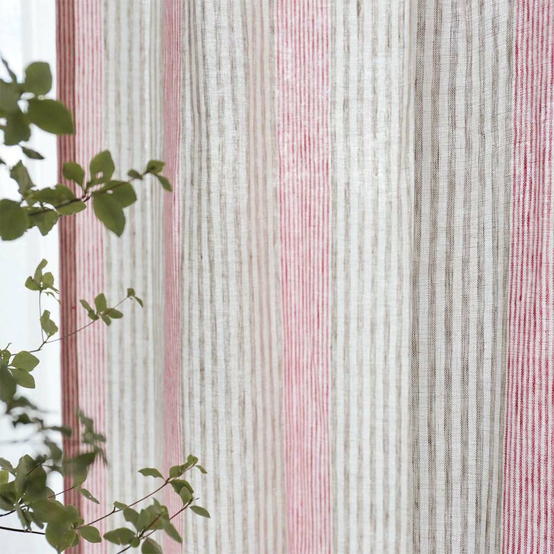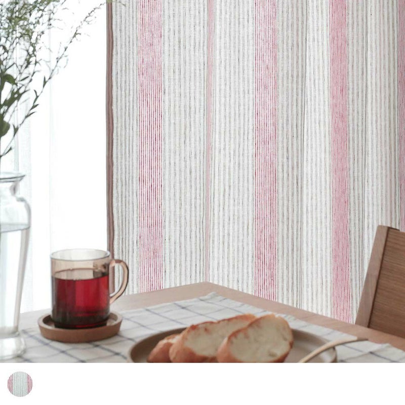 優しいレッドのストライプがアクセントのリネン100%カーテン。カジュアルな雰囲気は、フレンチカントリーの要素を感じつつ、カフェスタイルのお部屋に合わせたい1枚。環境にも優しい天然素材のカーテンを取り入れて、今より心地よく、環境をも考えた豊かな暮らしを過ごしませんか?