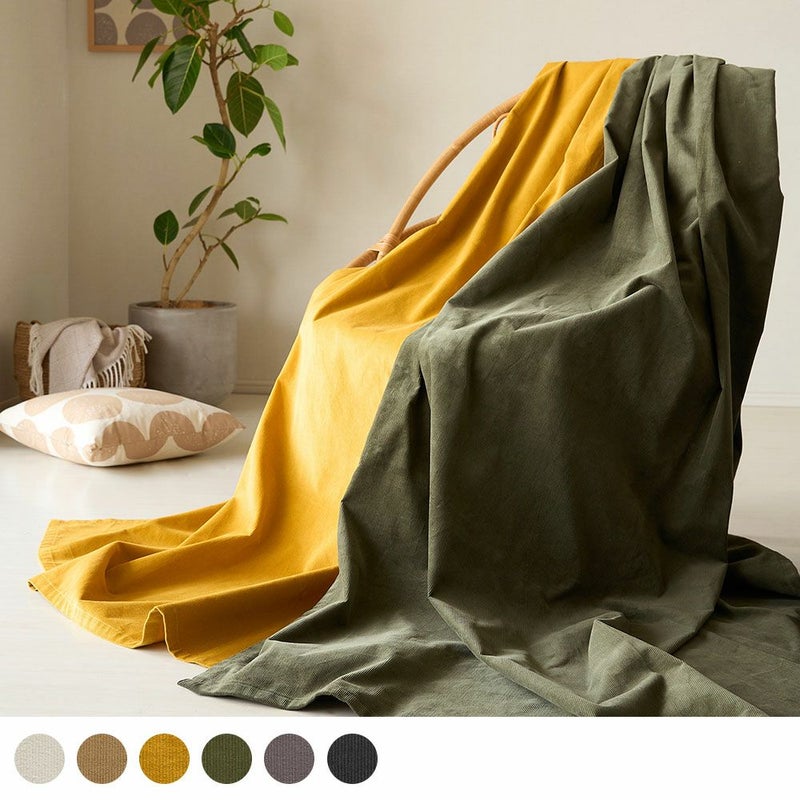 古くからワークウェアやカジュアルなアイテムに使われてきた、コットン・コーデュロイをカーテンに仕立てました。丈夫でふっくらとした厚みとハリ感が特長。コットンだからシワになりやすいし、ちょっと伸び縮みもする。コーデュロイの毛足の向きで色もムラに見えるかも。でもそれを全部含めてナチュラル感を楽しみたい。