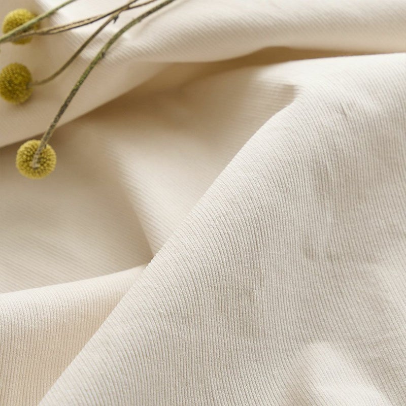 コーデュロイの種類の中では、中間よりやや細めの中細畝(ちゅうぼそうね)。ラフになりすぎず、きちんと感を兼ね備えています。上品ながらもコーデュロイらしい畝もしっかり見えて、カーテンとしてちょうどいい畝の太さです。