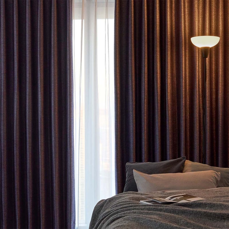 グリーン、ブラウン、パープル、そしてグレー。テルナータのカラー展開は、どれも深みがあり、落ち着いた大人の表情を持っています。ふんわりとまとめられた生地から覗く光沢は、多色の糸が重なり合って生まれる複雑な輝き。お部屋のテイストに合わせて、窓辺にひとつ上の品格とモダンな個性をプラス。