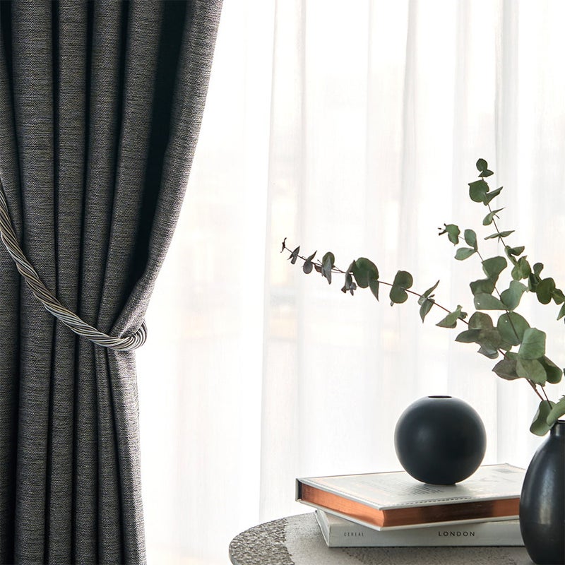 【撮影コーディネート】 タッセル<ヨル グレーパープル>タッセルでカーテンをまとめると、ヒダが重なり合い、ヨコ糸のラインがより鮮明に浮かび上がります。そのまま吊るしたときとは一味違う、複雑で豊かな表情。グレー&パープルのロープタッセルなど、小物とのコーディネートで、自分だけの「心地よい空間」を楽しんでください。