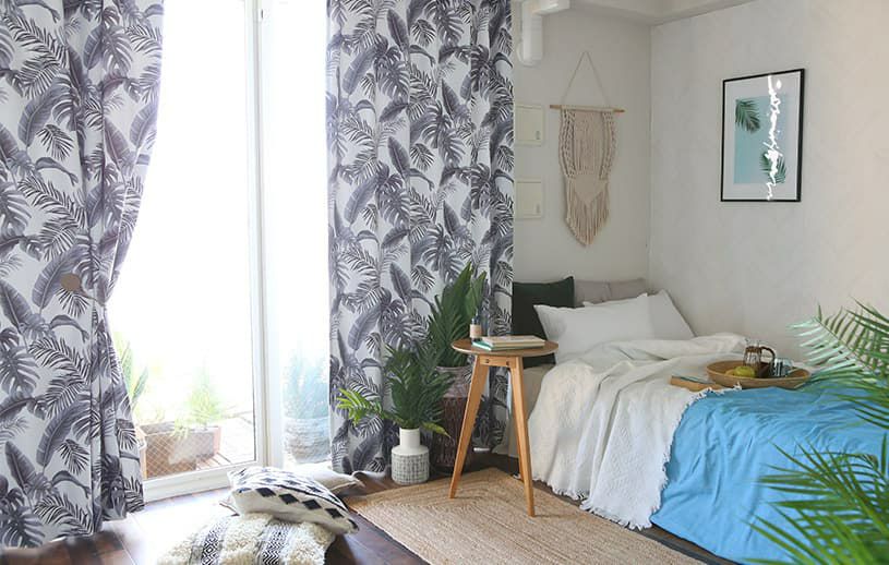 モノトーンのリーフ柄カーテンでヴィンテージハワイアンのお部屋に