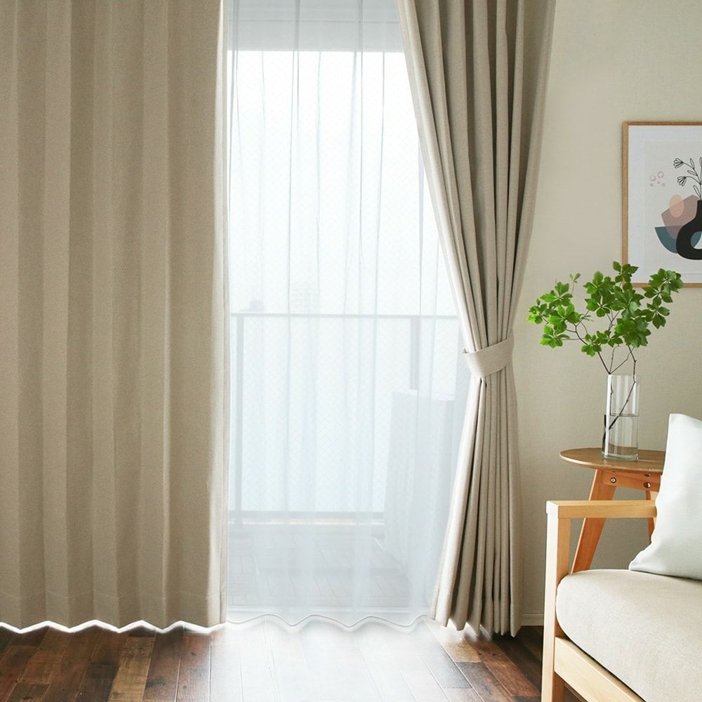 ベージュやグレーなど、淡い色のカーテンでも強い日差しをしっかりと遮ってくれるのが、完全遮光カーテンの魅力。