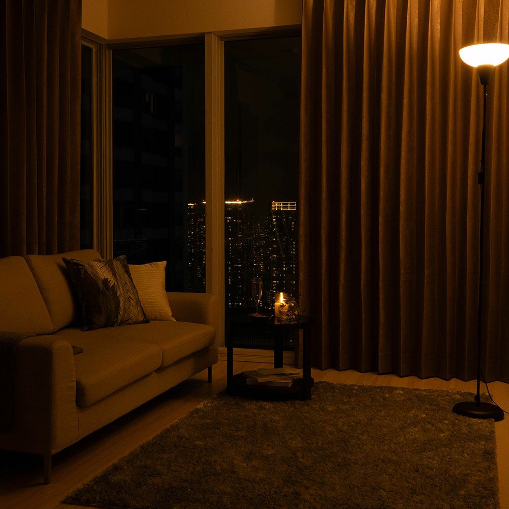 だからこそおすすめなのが、高い機能性をもつ「完全遮光カーテン」。ほぼ100%の遮光性、夏の暑さ・冬の寒さにアプローチする遮熱・保温性、そして高層階では外せない防炎機能。これらの機能は高層階での暮らしを各段に快適にしてくれることだろう。