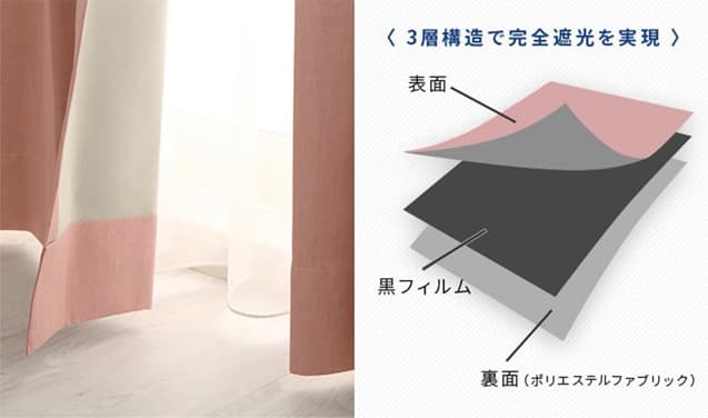 裏面に樹脂(ボンディング)加工、あるいは生地と生地の間に遮光フィルムを挟み込むサンドウィッチ加工を施すことで、徹底的に遮光にこだわったカーテンです。